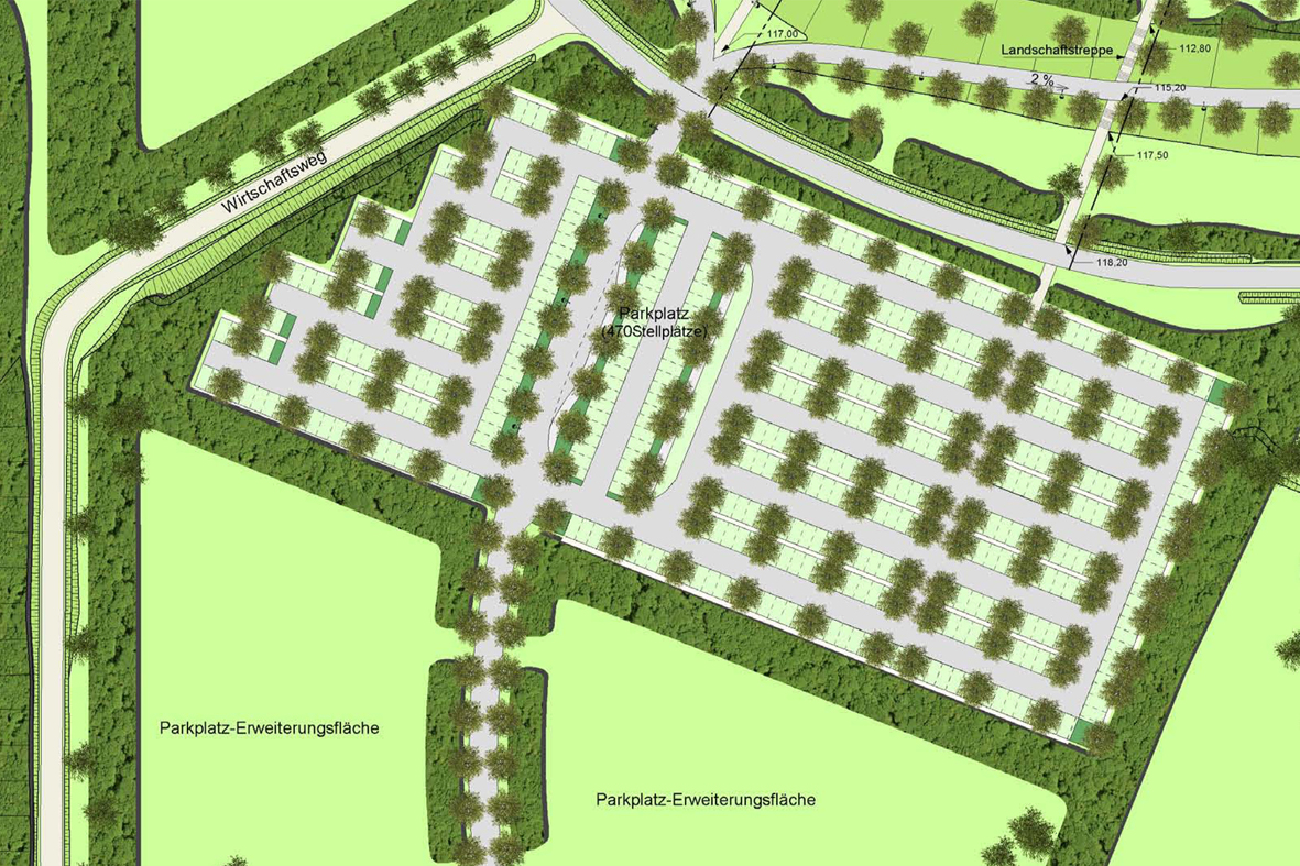 Um die Anziehungskraft des Standorts weiter zu erhöhen, wird auch vorgeschlagen, Flächen oberhalb der vorhandenen Böschung entlang des Rundweges für weitere potentielle Nutzungen vorzubereiten, die die Angebotspalette am Standort sinnvoll ergänzen. Insbesondere die Bereitstellung einer Fläche westlich des Rundwegs für die perspektivische Nutzung als Sport(event-)fläche ist hier zu nennen.