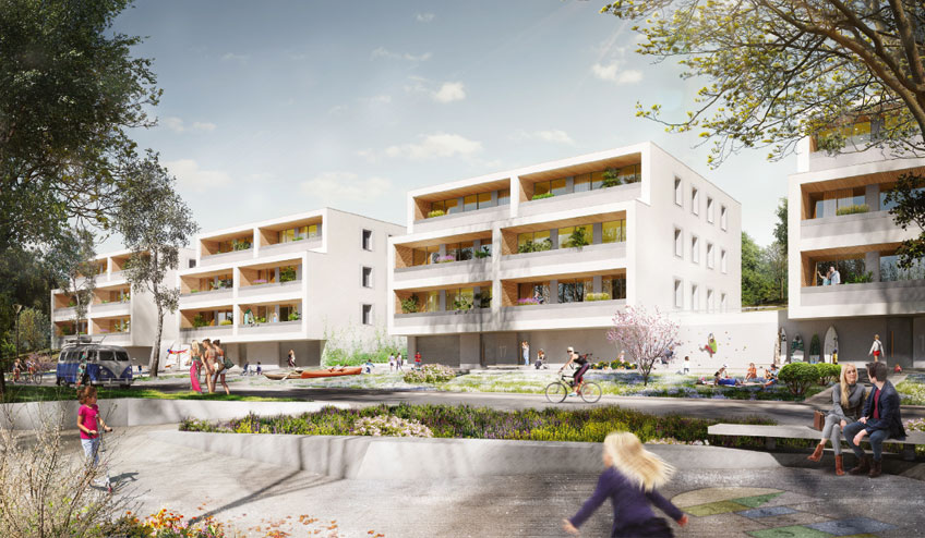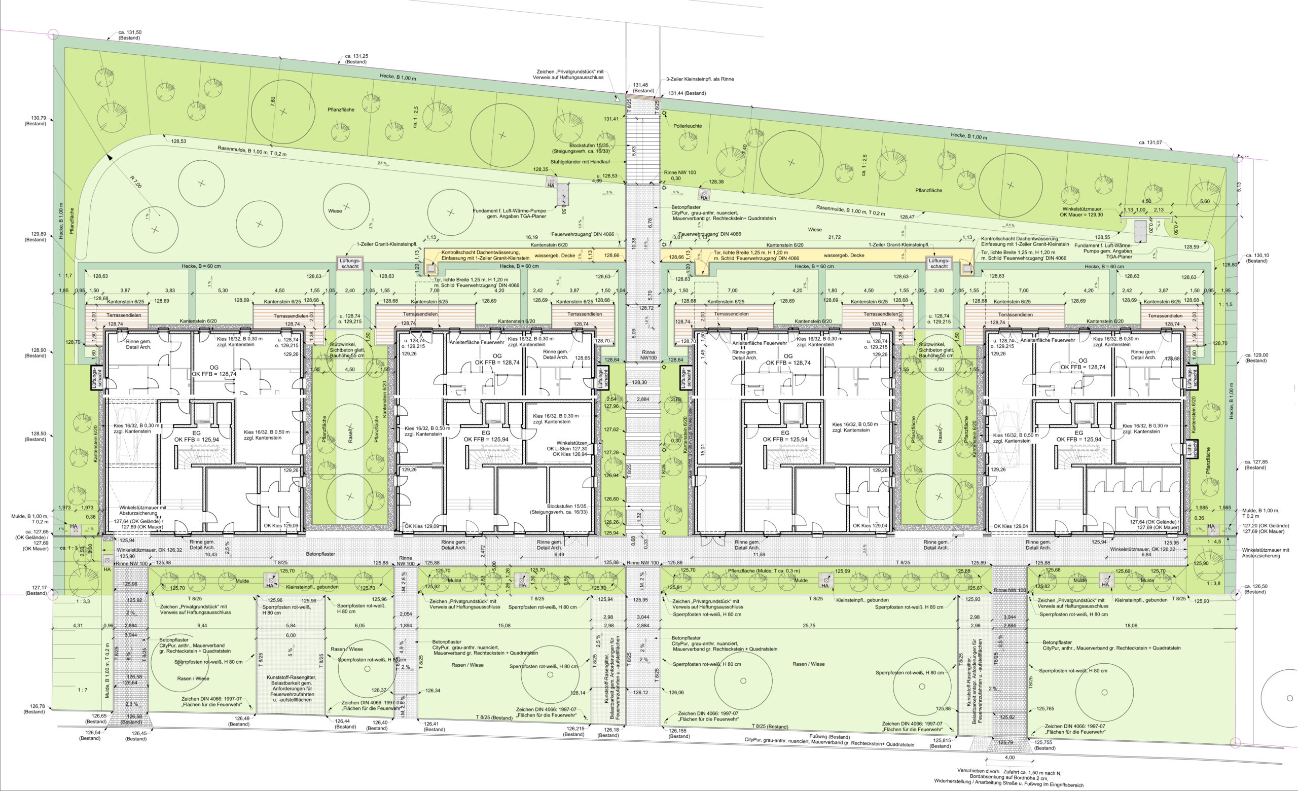 In den modernen Mehrfamilienhäuser entstehen 30 moderne Wohneinheiten. Nicht nur für optische Entspannung sorgen die mit viel Grün angelegten Außenanlagen sowohl vor als auch hinter den Gebäuden. In Entsprechung zur Architektur dominieren bei der Gestaltung klare Linien und Formen. Ca. 350 lfm geschnittene Hecken definieren die Grenzen des Gesamtareals sowie der priavten Nutzungsbereiche, die etwa 1.300 m² Staudenpflanzungen dagegen steigern mit ihrem Blütenreichtum über weite Teile des Jahres auf besonders ansprechende Weise die Attraktivität des Areals.