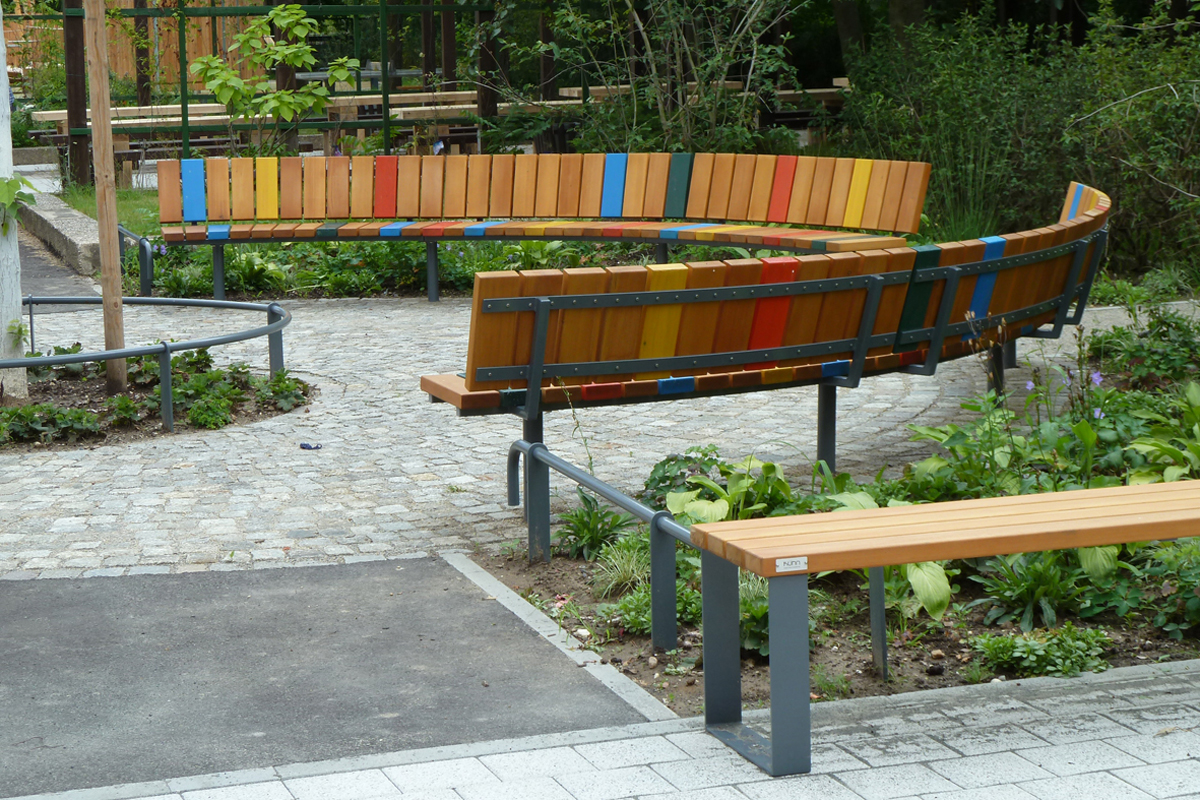 Durch eine klare Gliederung und Zonierung der Anlage wurde auch darauf hingewirkt, die Aneignung unterschiedlicher Bereiche durch Kinder mit verschiedenen Interessen zu fördern. Im Gegensatz zur beschriebenen Aktivzone, die der Spielbereich am einen Ende des Pausenhofs darstellt, erhält der westliche Teil des Schulhofgeländes einen eher ruhigeren Charakter. Die hier vorhandenen bzw. neu anzulegenden Flächen (Schulgarten, Grünes Klassenzimmer, Grillplatz, Sitzrondell) bieten den Kindern vor allem die Gelegenheit zum Entspannen, Rückzug, Reden und Sitzen.