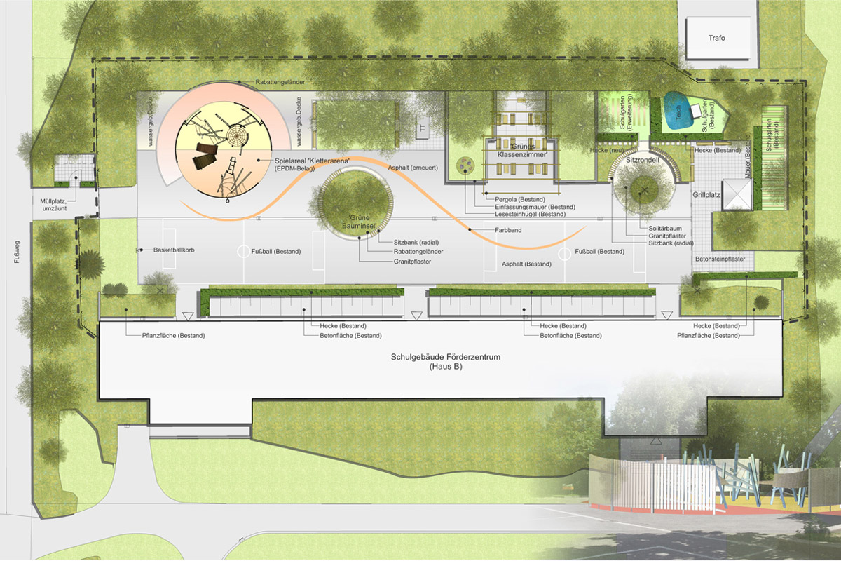 Mit dem Entwurf für die Neugestaltung des Schulhofareals wurde versucht, die unterschiedlichen Nutzungsanforderungen an das Schulhofgelände zu berücksichtigen sowie dem Areal ein homogenes Gesamtbild zu verleihen. ‚Funktionierende’, erhaltenswerte Bestandsstrukturen wurden nicht zuletzt aus wirtschaftlichen Gründen in die Planung integriert.