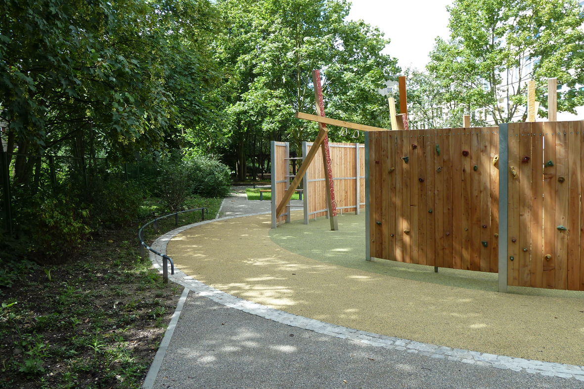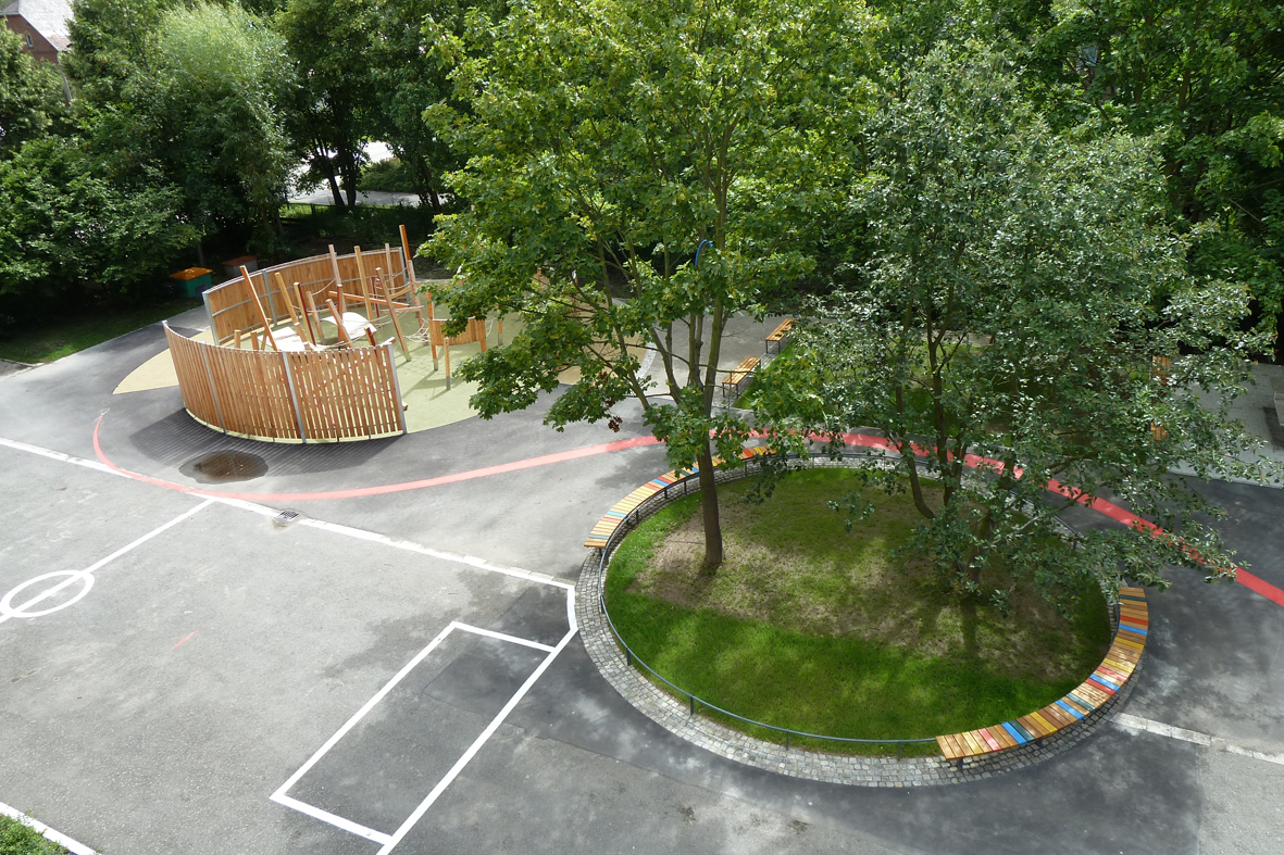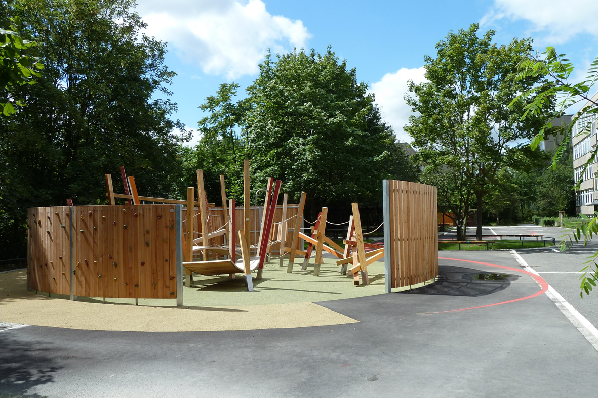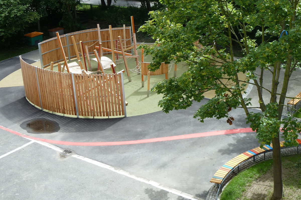 Ein wesentlicher Bestandteil der Planung war die Anlage eines großzügigen Spielareals. Dem im Zusammenwirken mit dem Spielplatzdesigner Veit Grasreiner gestalteten Areal liegt die Idee zugrunde, einen eigenständigen Raum innerhalb des Schulhofareals entstehen zu lassen. Die kreisförmige Anlage wird zur Kletterarena. Im Inneren des Kreises bietet ein Geflecht aus Pfosten, Balken und gebogenen Wänden unterschiedlich schwierige Kletter- und Spielangebote. Gleichzeitig entstehen unterschiedliche Sitz- und Versteckmöglichkeiten. Auch die umlaufenden Wände selbst fungieren als Spielelemente.