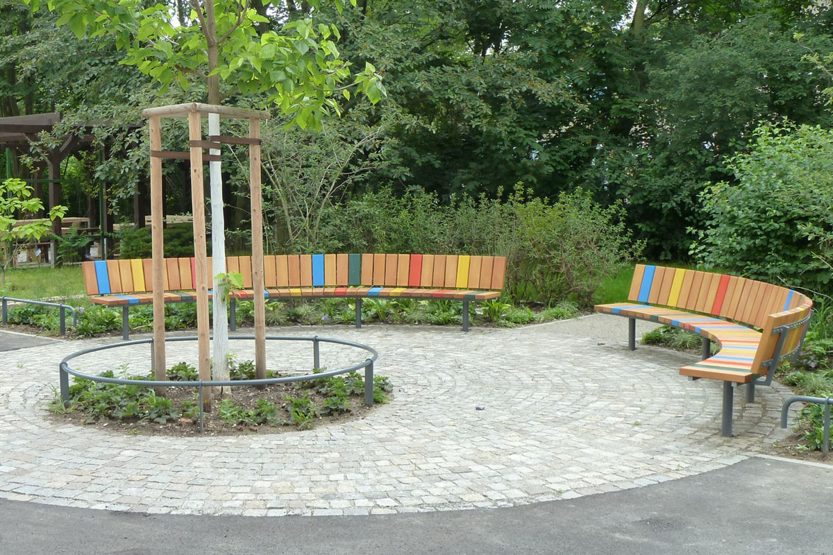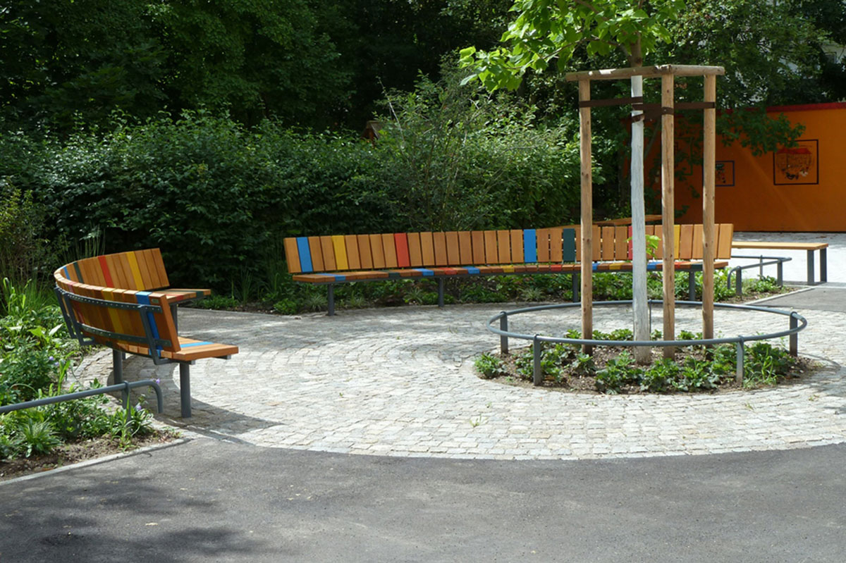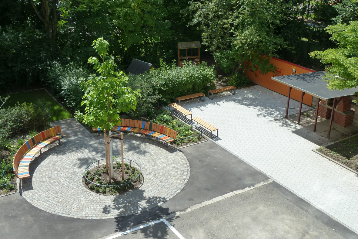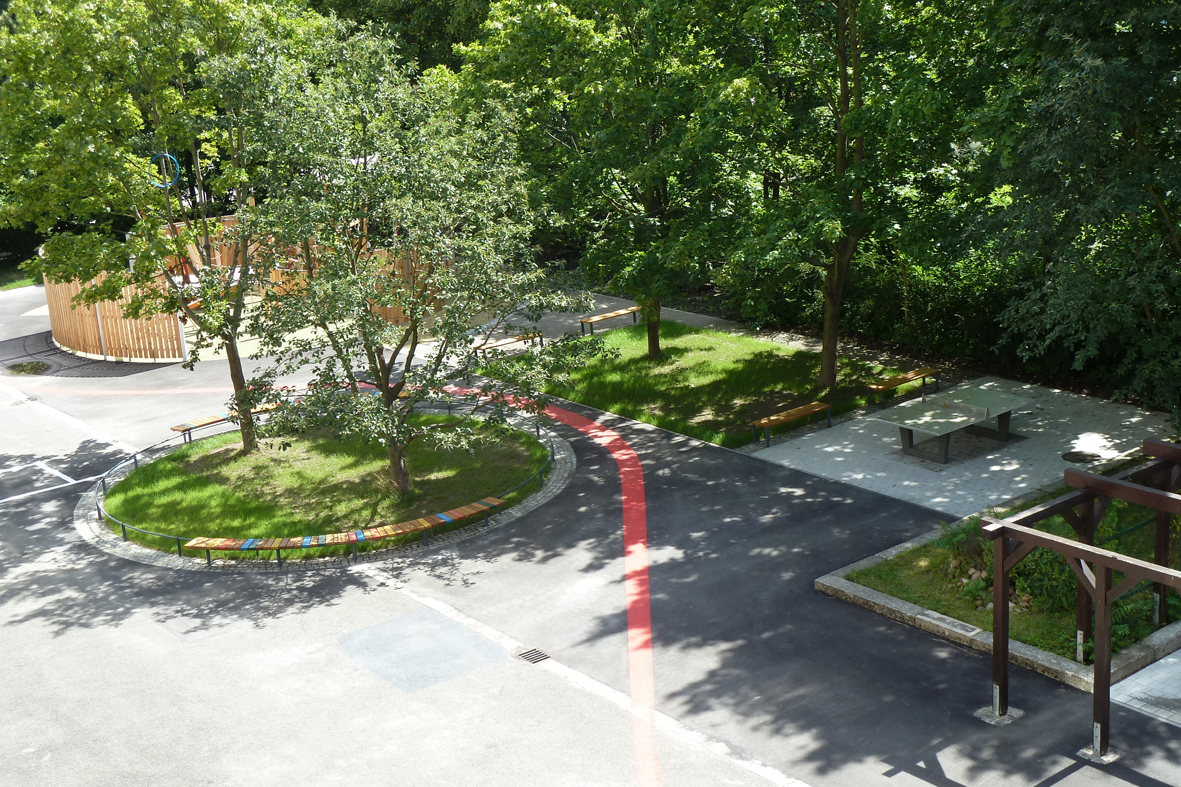 Bei der Suche nach einer gestalterischen Lösung für das Gesamtareal wurde eine ausgewogene Mischung aus den bislang prägenden orthogonalen Formen und dem Kreis als charakteristischer Form für die neu herzustellenden Bereiche gewählt. Trotz der Gegensätzlichkeit ergibt sich hierbei ein harmonisches und im Zusammenspiel der Grundformen neues Gesamterscheinungsbild des Schulhofs. Mit Hilfe des Gestaltungsmittels Farbe (Farbband als geschwungene Linie auf der Asphaltfläche) werden die unterschiedlichen Objekte bzw. Zonen des Schulhofs darüber hinaus auch visuell miteinander verknüpft.
