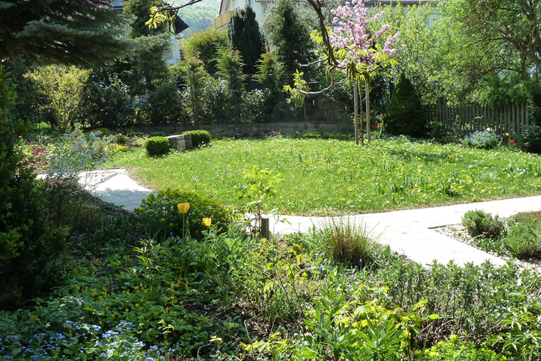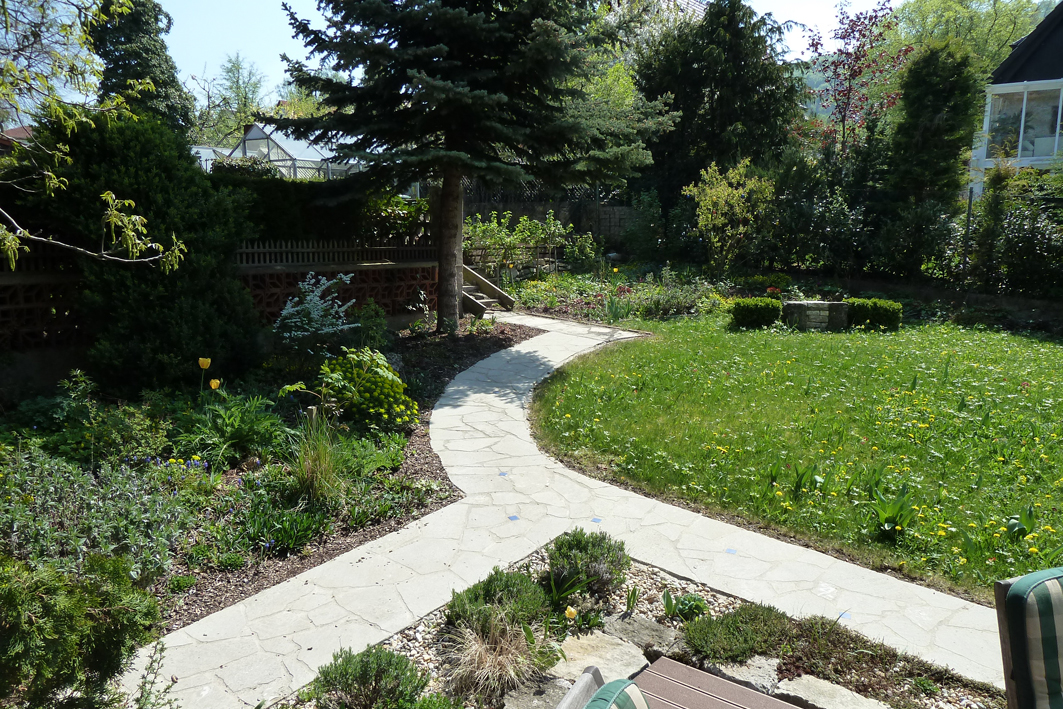 Das Neuarrangement von Pflanzflächen, Nutzgartenbereichen und offenen Rasenflächen stand im Mittelpunkt der Umgestaltung des Hausgartens. Dem Gestaltungsansatz folgend wurde ebenso die Wegeführung verändert. Der mit Kalksteinplatten befestigte Weg umschließt dabei zusammen mit den neu angelegten Pflanzbereichen einen kreisförmigen Rasenspiegel, der buchstäblich das zentrale Gestaltungselement des Gartens darstellt. Eine neu angelegte Terrasse vermittelt schließlich zwischen innen und außen, zwischen dem geschlossenen Wohn- und dem offenen Gartenraum.