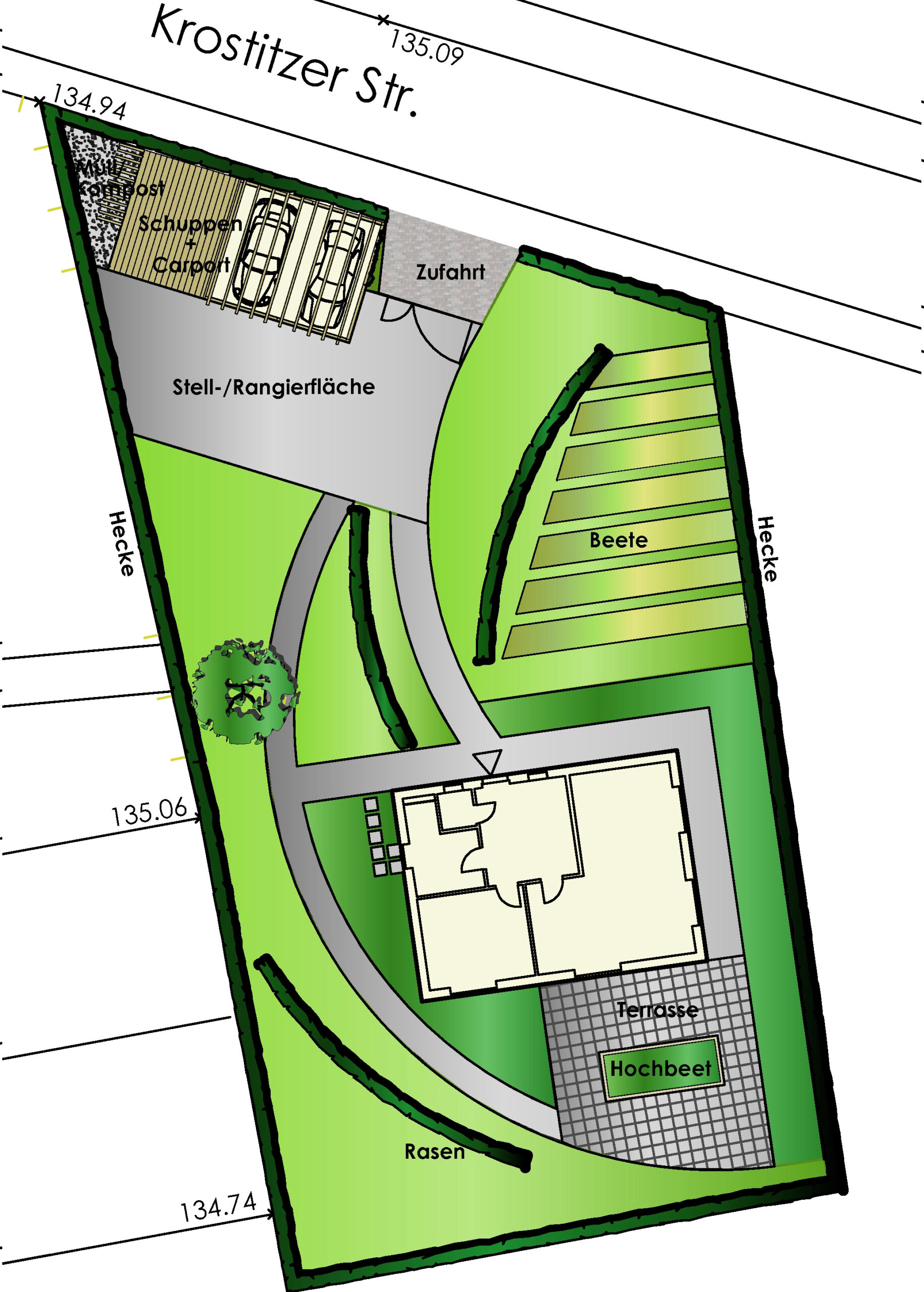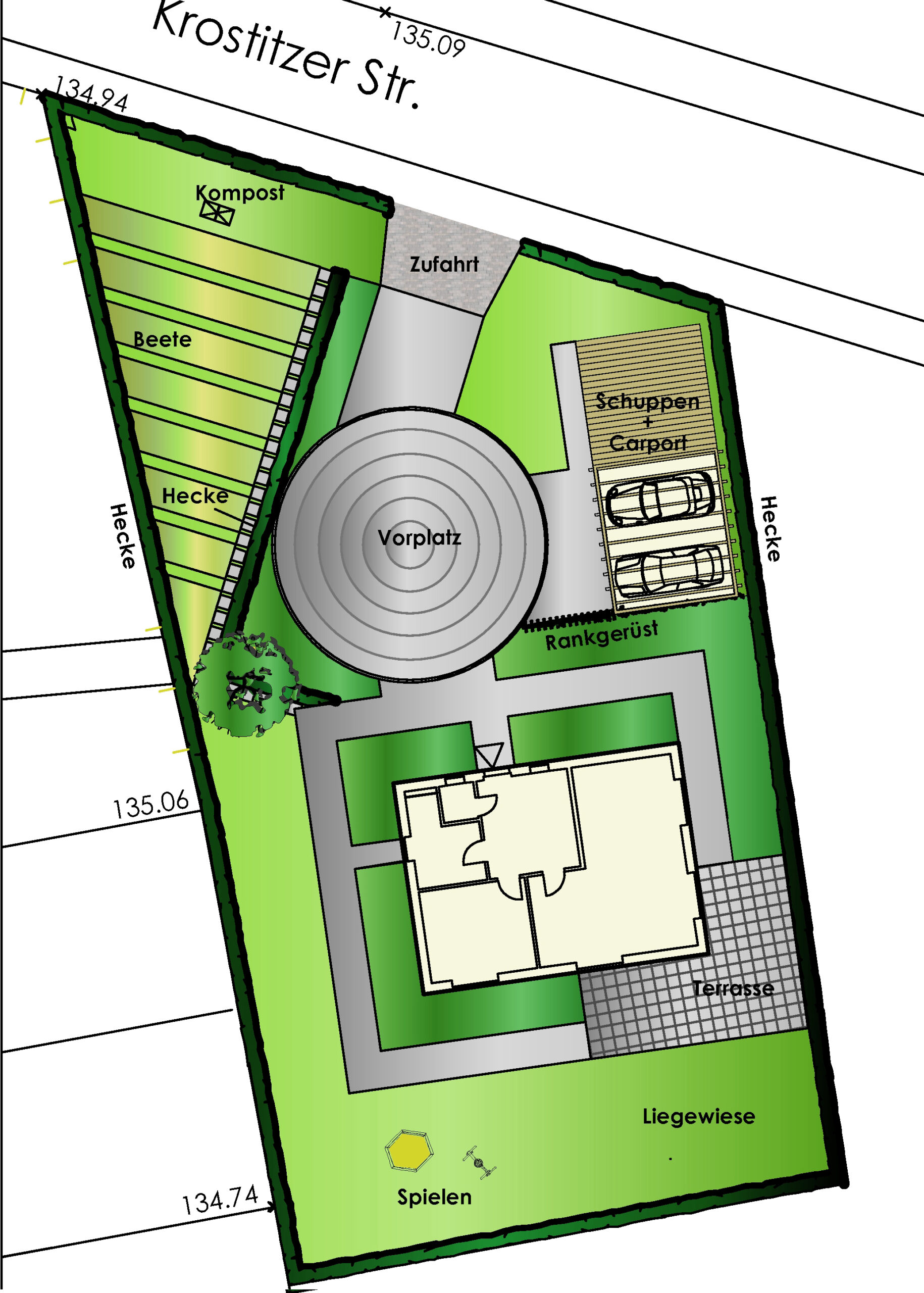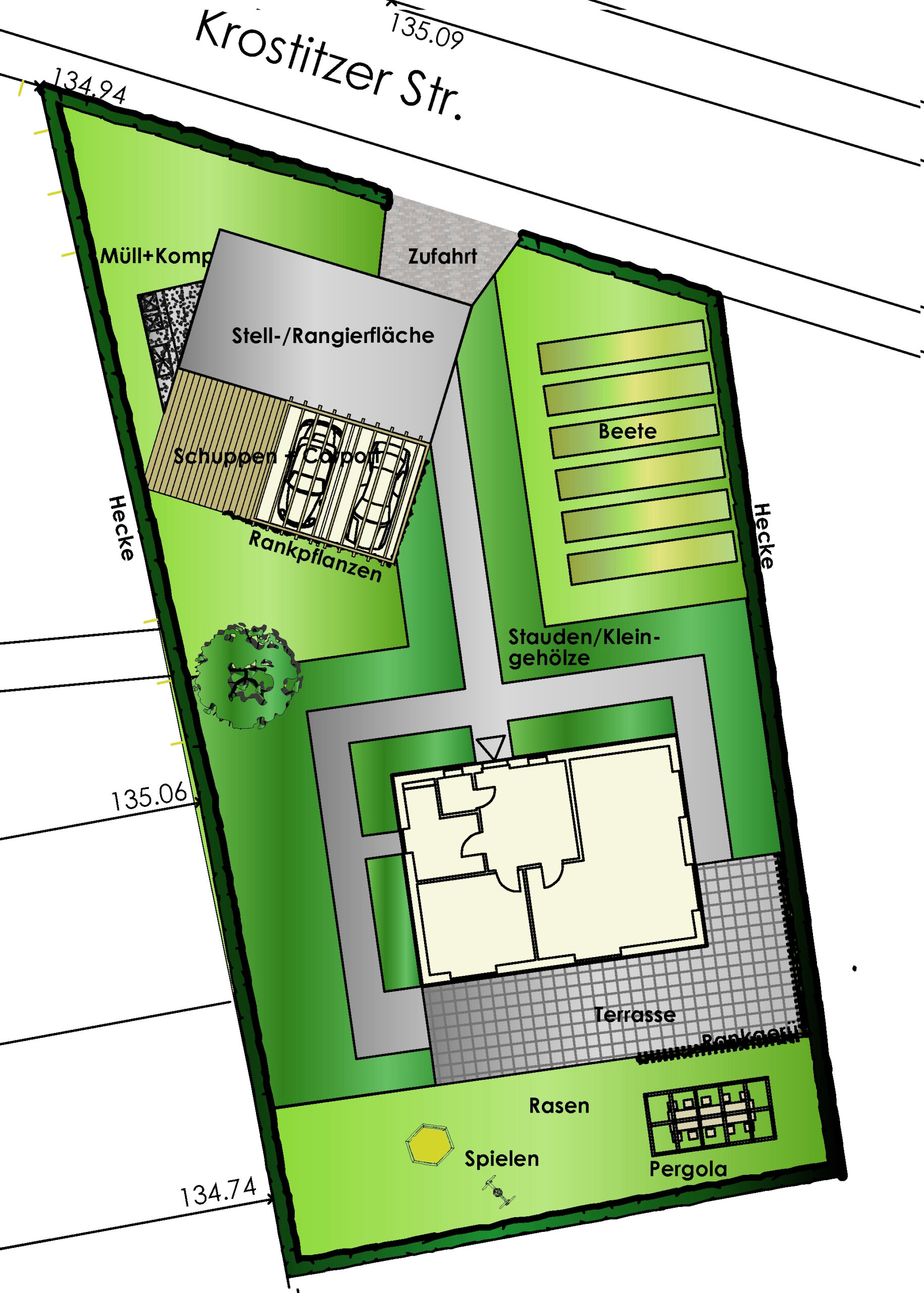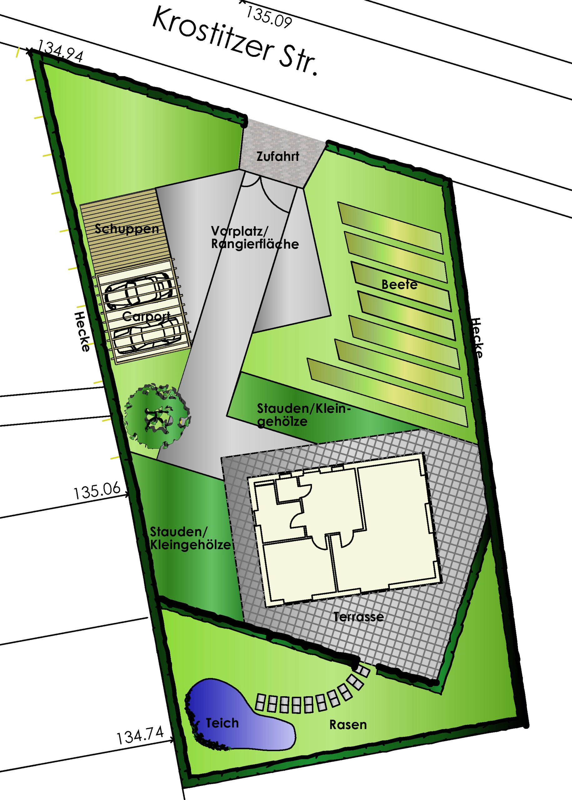 Für die Neuanlage eines Privatgartens im Zuge eines Eigenheimneubaus wurden verschiedene Vorentwurfsvarianten erarbeitet. Inhalt der Planung war im Wesentlichen die funktionale Gliederung der Freiflächen. Dabei galt es, neben der Definierung von Pflanzflächen, Nutzgartenbereichen, Wegen und Terrassenbereichen trotz beengter Platzverhältnisse auch Möglichkeiten der Anordnung von Zufahrt, Stellflächen, Garage und Carport aufzuzeigen. Die detaillierte Ausformulierung der Planung sowie die Realisierung erfolgten in Eigenleistung der Bauherren.