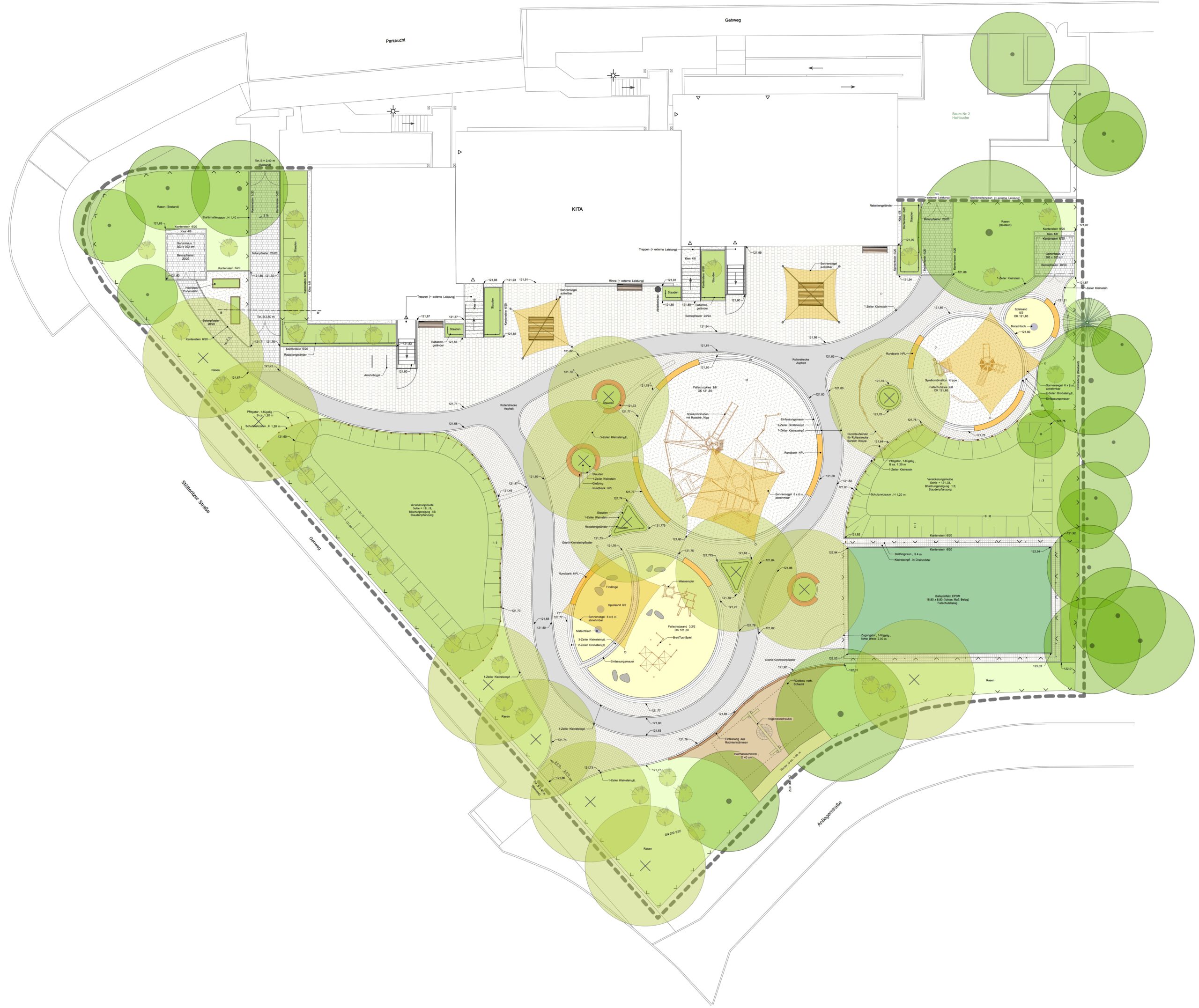 Ergänzt wird die Anlage durch Sitzbänke, Tische, Rundbänke, Hochbeete, Sonnensegel, Fahrradbügel, eine Vogelnestschaukel sowie zwei neue Geräteschuppen aus WPC. Die bestehenden Zufahrten bleiben erhalten, sodass Pflege- und Wartungsarbeiten weiterhin gewährleistet sind. Insgesamt entsteht eine vollständig erneuerte, sichere und klar strukturierte Außenanlage mit hoher Aufenthaltsqualität und vielfältigen Spielmöglichkeiten.