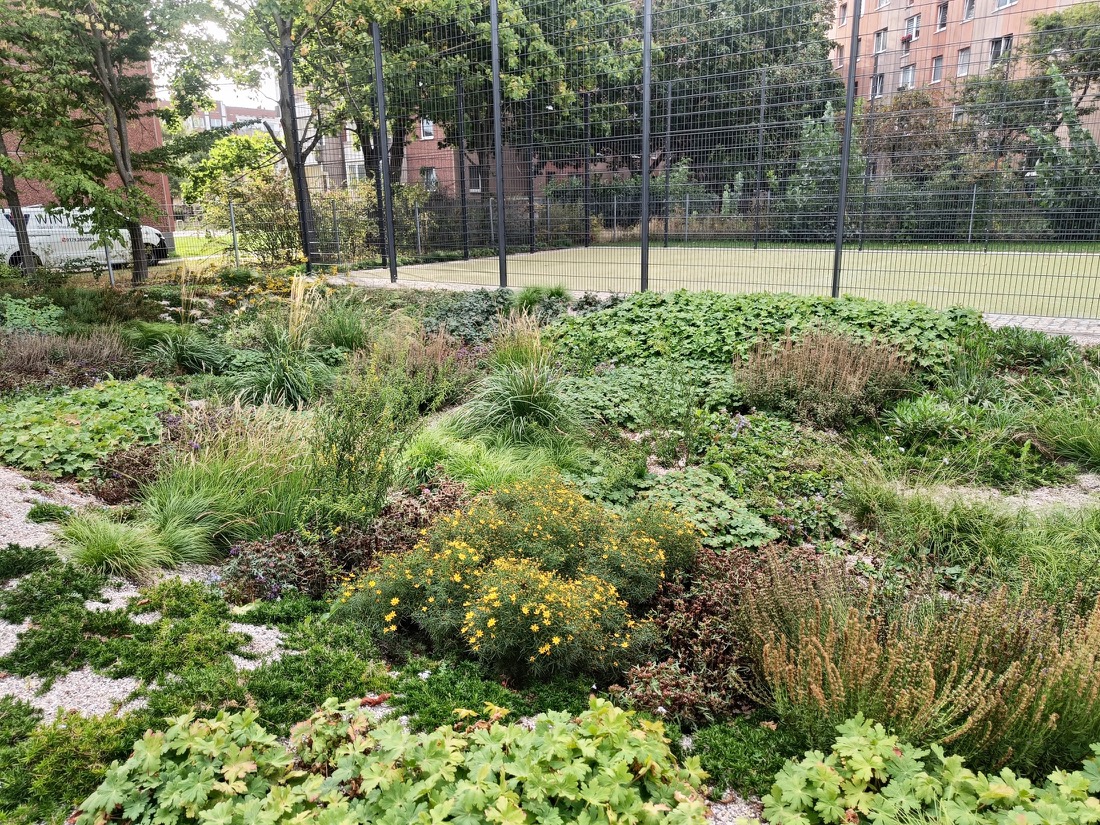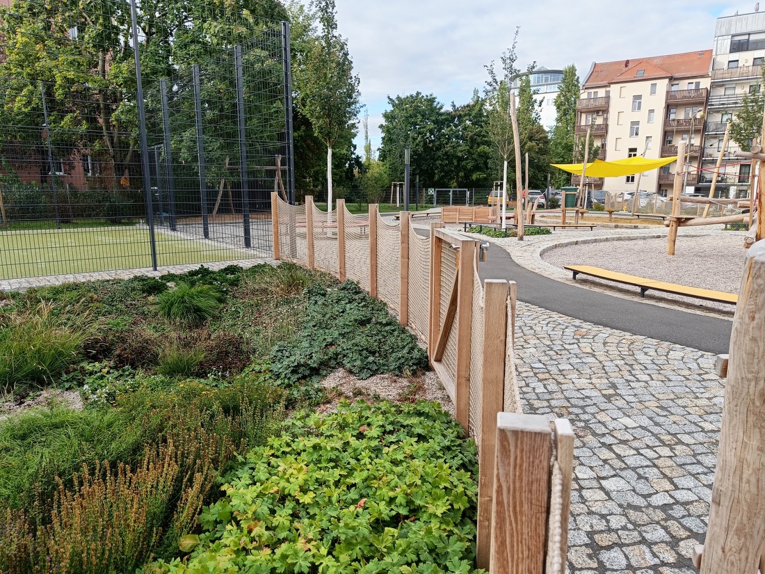 Ein wesentliches Element der Freianlagen sind die 2 bepflanzten Versickerungsmulden zur Regenwasserbewirtschaftung. Das Niederschlagswasser wird oberflächig eingeleitet und über durchlässige Bodenschichten versickert. Reichblühende Staudenpflanzungen sichern eine dauerhafte Funktionsfähigkeit, fördern die Durchwurzelung und schaffen ökologische Qualitäten. Zum Schutz vor Betreten werden die Mulden mit einem optisch zurückhaltend gestaltetem Netzzaun eingefriedet.