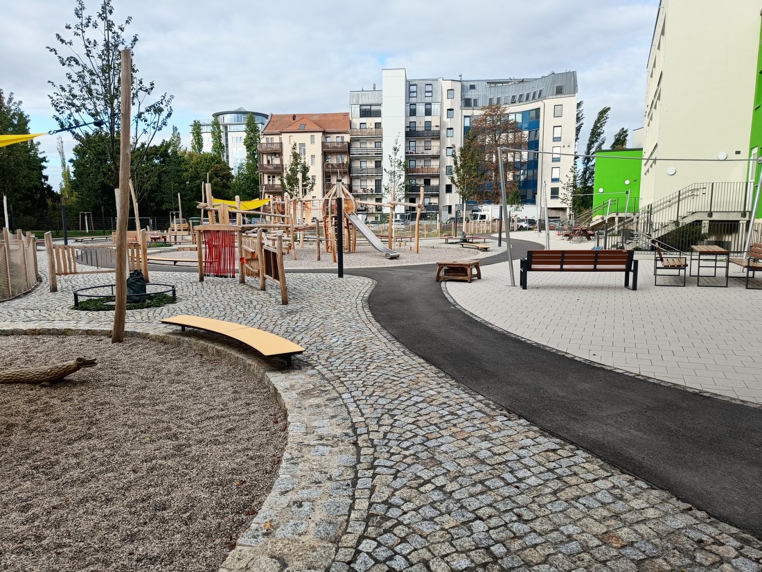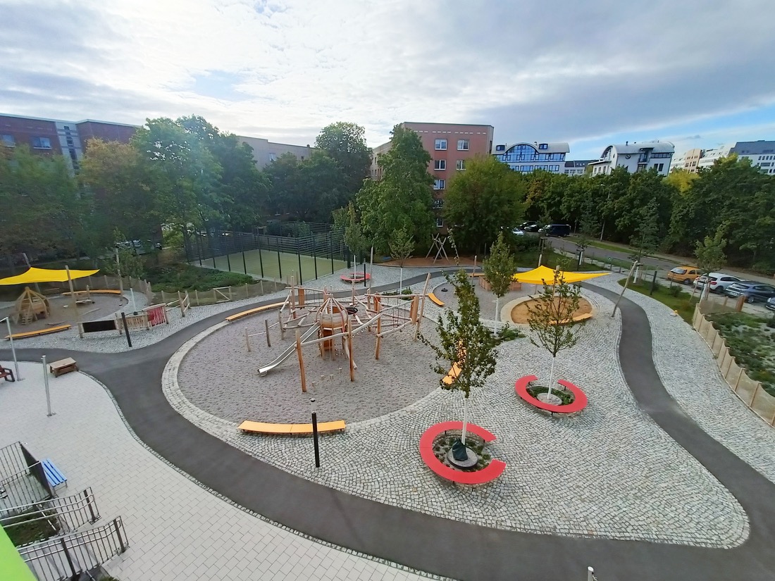 Das Büro LAGO wurde von der Stadt Leipzig, vertreten durch das Amt für Gebäudemanagement, mit der Neugestaltung des Außenspielbereichs der Kita Stötteritzer Str. 1 in Reudnitz-Thonberg beauftragt. Eine erste Planung aus dem Jahr 2019 musste verworfen werden, nachdem erhebliche Baugrundprobleme festgestellt wurden. Untersuchungen zeigten, dass weite Teile des Geländes mit belastetem Bauschutt und nicht tragfähigen Materialien verfüllt waren, was bereits zu Setzungen geführt hatte. Nach vorübergehender Schließung der Kita wurde 2023 ein nahezu vollständiger Bodenaustausch bis zur Sohle der ehemaligen Keller durchgeführt. Auf dieser Grundlage erfolgte die komplette Neuplanung der Freianlagen.