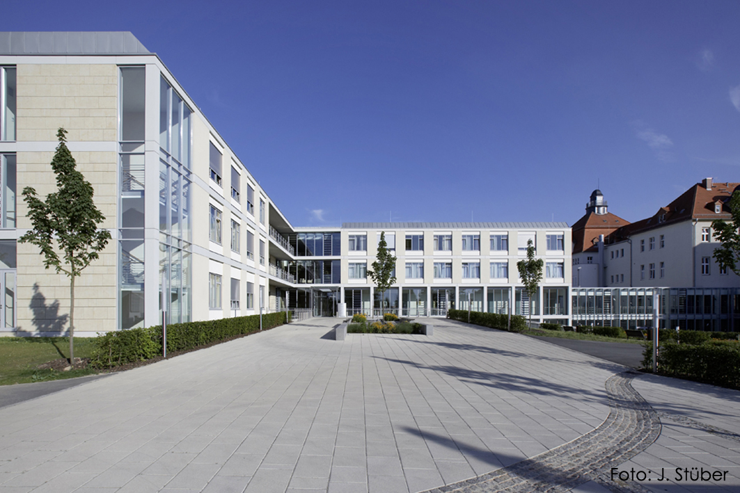 Im Zusammenhang mit dem Neubau eines Bettenhauses für das Kreiskrankenhaus Glauchau wurden umfangreiche Teile des Klinikareals neu gestaltet. Ein Schwerpunkt lag dabei auf der Verknüpfung des Vorplatzareals für das neue Bettenhaus mit den bestehenden Außenanlagen im östlichen Bereich sowie dem Hauptzugangsbereich des Zentralgebäudes der Klinik. Die Überwindung des erheblichen Höhenunterschieds zwischen Zentralgebäude und Neubau stellte dabei eine besondere Herausforderung dar. Neben der Wege- und Platzgestaltung sowie der vegetationstechnischen Maßnahmen, der Anlage einer großzügigen Freitreppe sowie eines Wasserspiels war auch die Anlage verkehrstechnische Erschließung inkl. der Anlage einer Umfahrungsstraße Bestandteil der Planung.