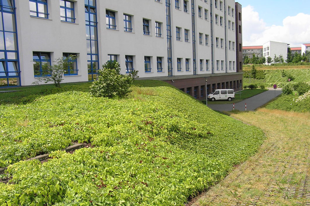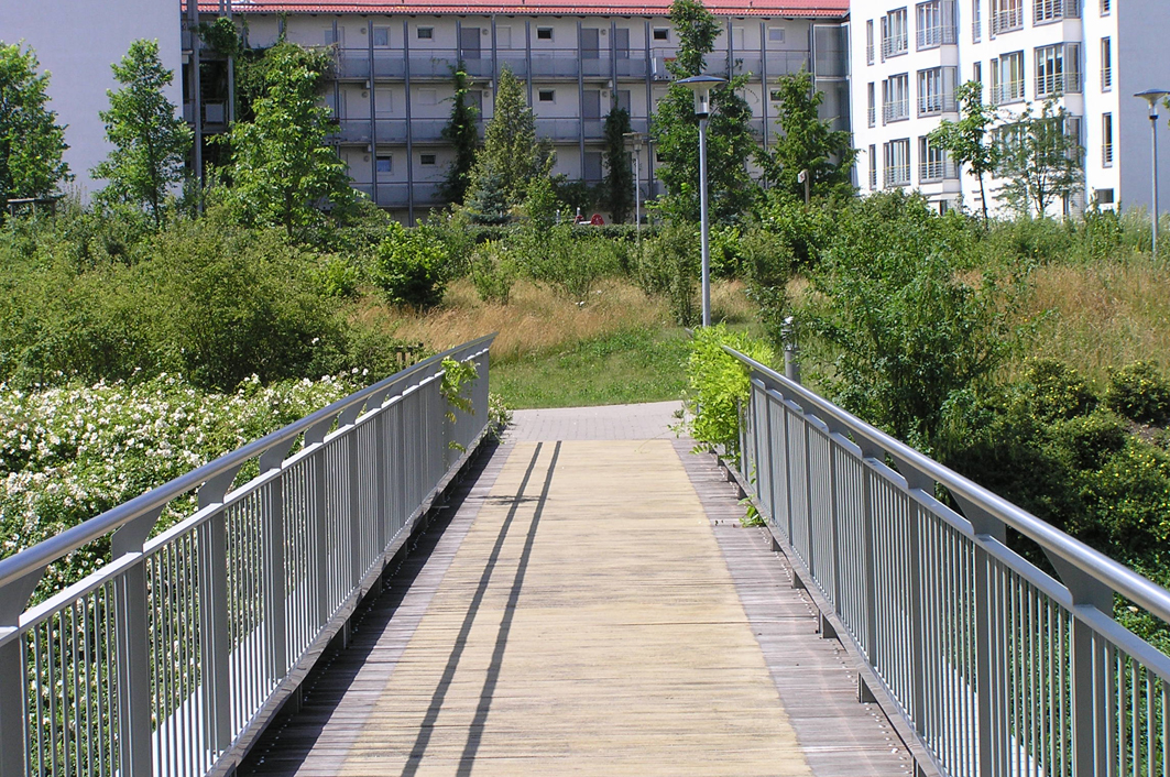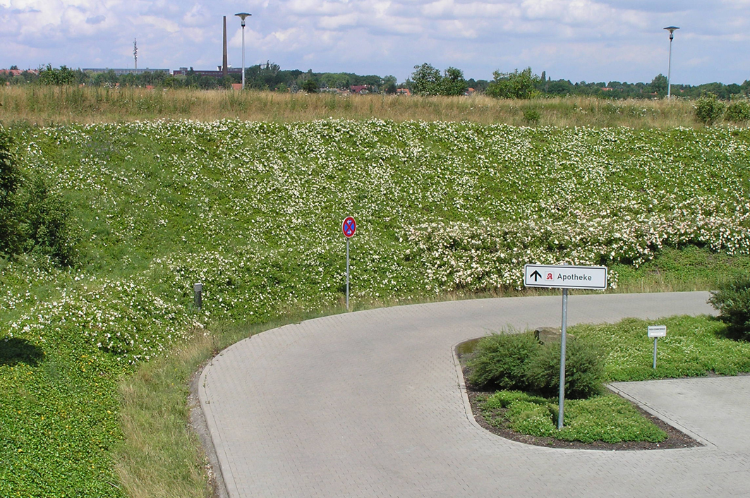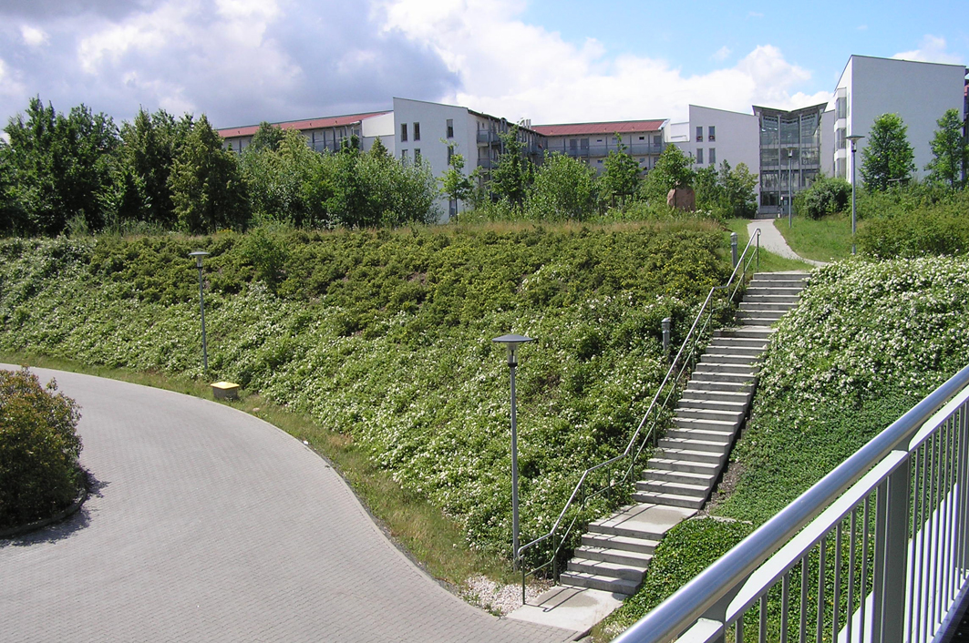 Im südöstlichen Leipziger Stadtteil Probstheida realisierte die Rhön-Klinikum AG seit Mitte der 90er Jahre mehrere Klinik-Neubauten, die zusammen das sog. Medizinisch-Wissenschaftlichen Zentrum bilden. Die Somatische Klinik ist Bestandteil dieses Klinik-Komplexes. Die im Zusammenhang mit dem Neubau vorgenommene Freiflächengestaltung beinhaltete neben der Anlage von Wegen und Platzflächen vor allem umfangreiche vegetationstechnische Maßnahmen. Die Bepflanzung großflächiger Böschungsbereiche mit ansprechenden, v.a. blühenden Pflanzen, die zugleich die Funktion der Böschungssicherung übernehmen, war eine besondere Herausforderung bei der Planung. Daneben galt es, das in direkter Nachbarschaft befindliche Wohngebiet in das Gestaltungskonzept einzubeziehen und durch geeignete Bepflanzungsmaßnahmen und Wegeführungen mit dem Klinikareal zu verknüpfen.