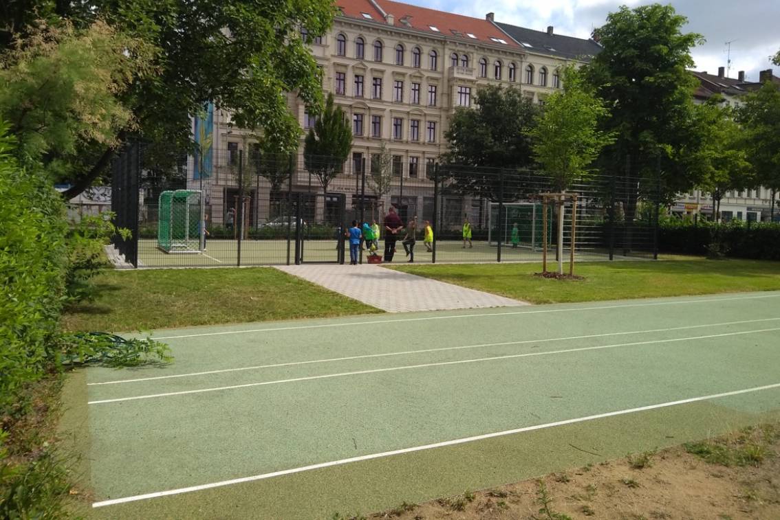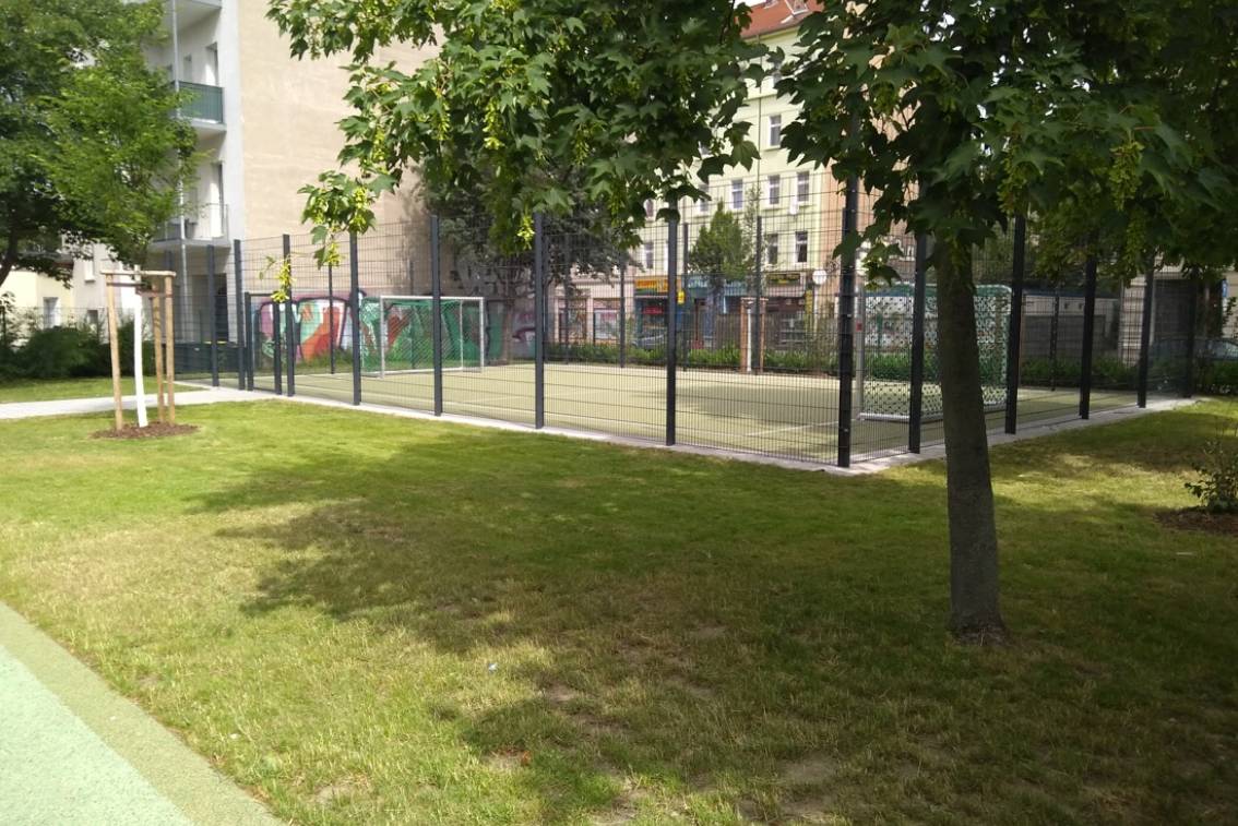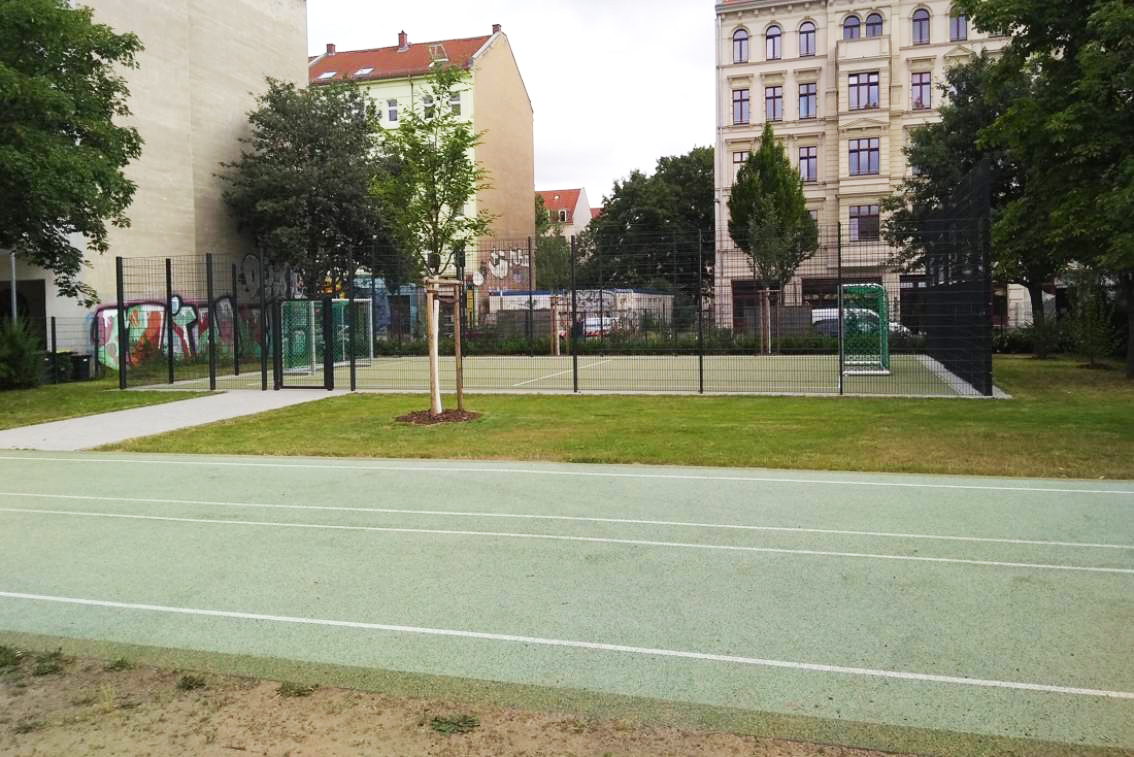 Um die Beeinträchtigung benachbarter Flächen zu minimieren, erhielt das Spielfeld einen 3-4 m hohen Ballfangzaun. Als Flächenbefestigung wurde ein Kunststoffbelag realisiert.