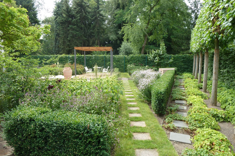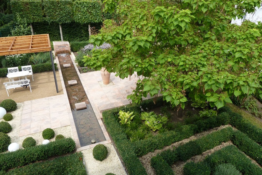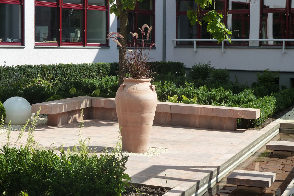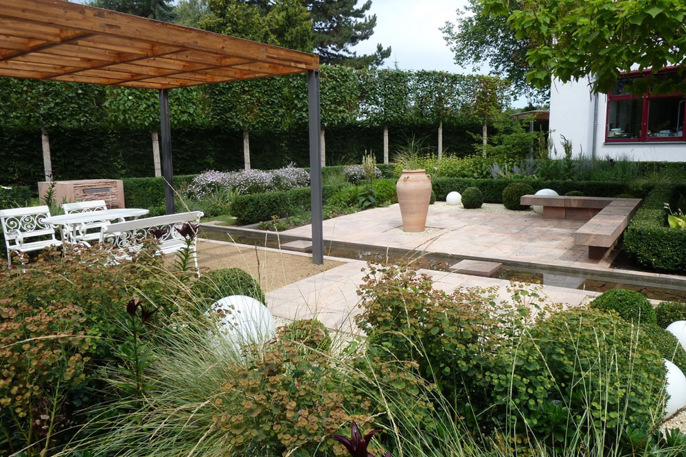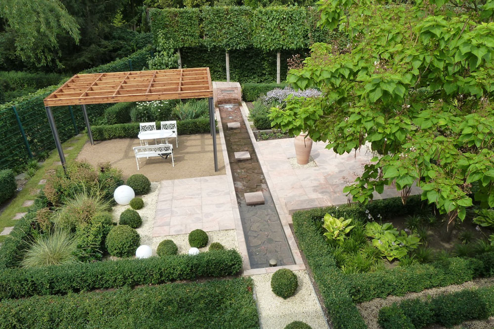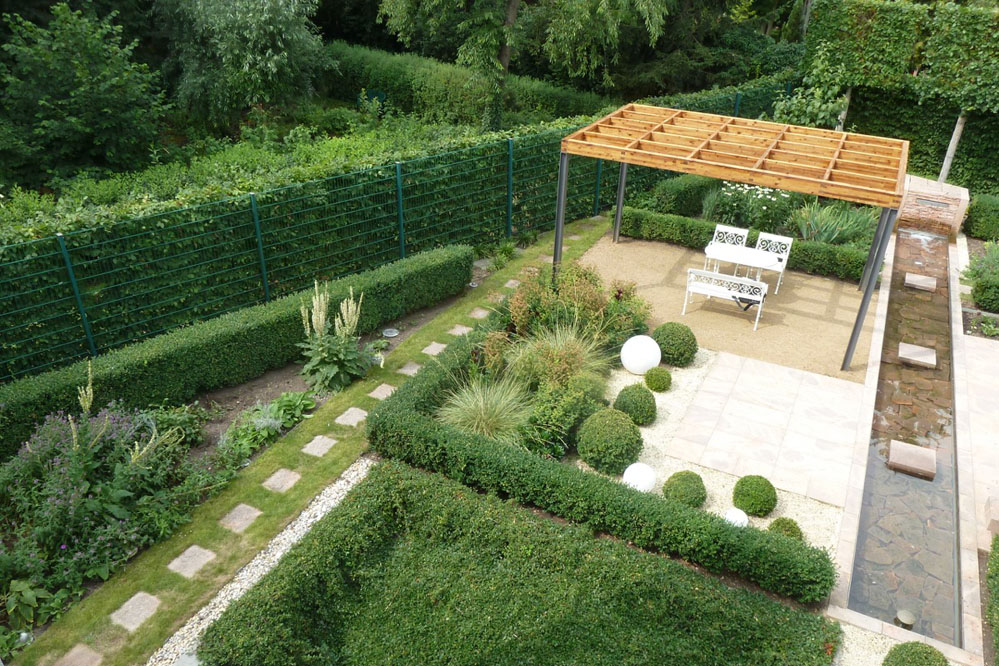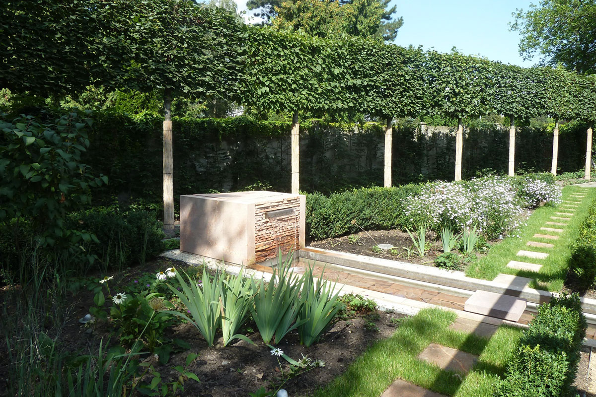 Bestehende Strukturen und Anlagen, wie das lineare Wasserbecken oder auch die vorhandene Pergola, sollten teilweise in das neue Gestaltungskonzept integriert werden. Ebenso war es ein Anliegen des Bauherren, einem recht formalen Gestaltungsgrundsatz zu folgen, bei dem in Form geschnittene Hecken, Bäume, Sträucher eine wichtige Rolle spielen. Daneben bestand die Notwendigkeit eines hohen Sichtschutzes zum benachbarten Friedhof, der auch die Höhe des Bürogebäudes berücksichtigt, aber hinsichtlich des Platzbedarfs und der räumlichen Wirkung auf die Proportionen der Anlage Rücksicht nimmt.