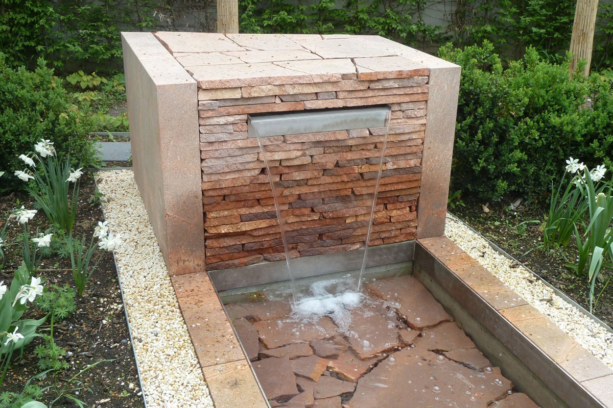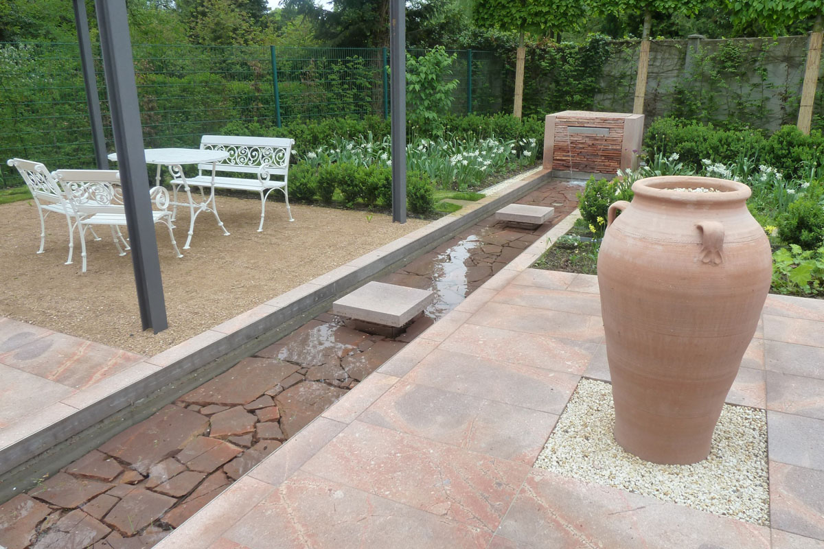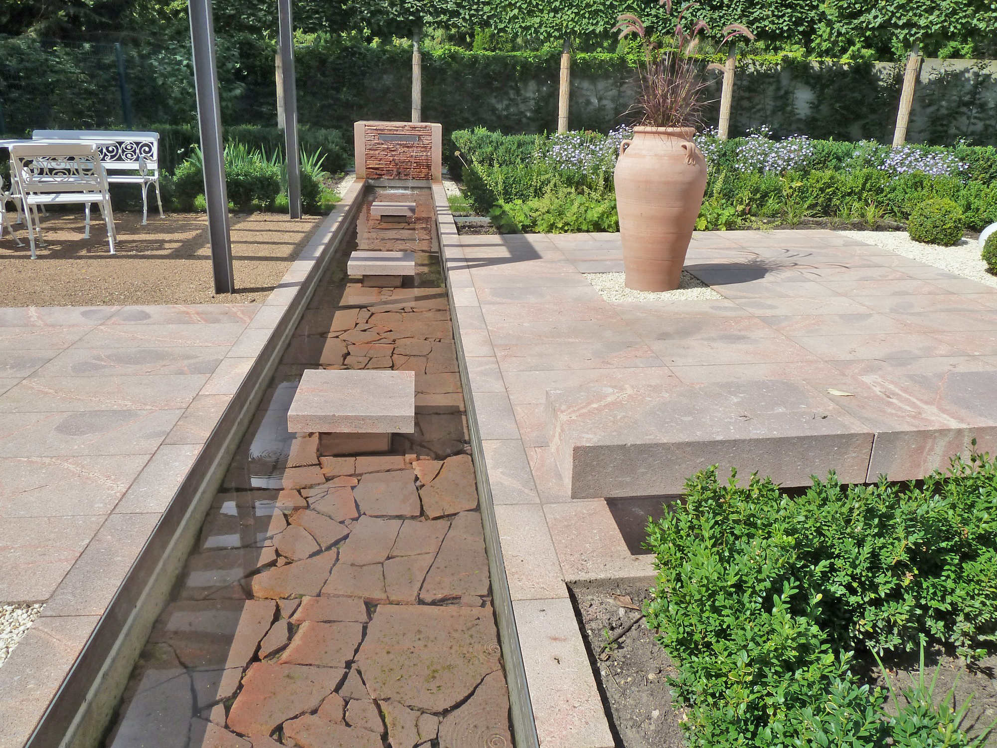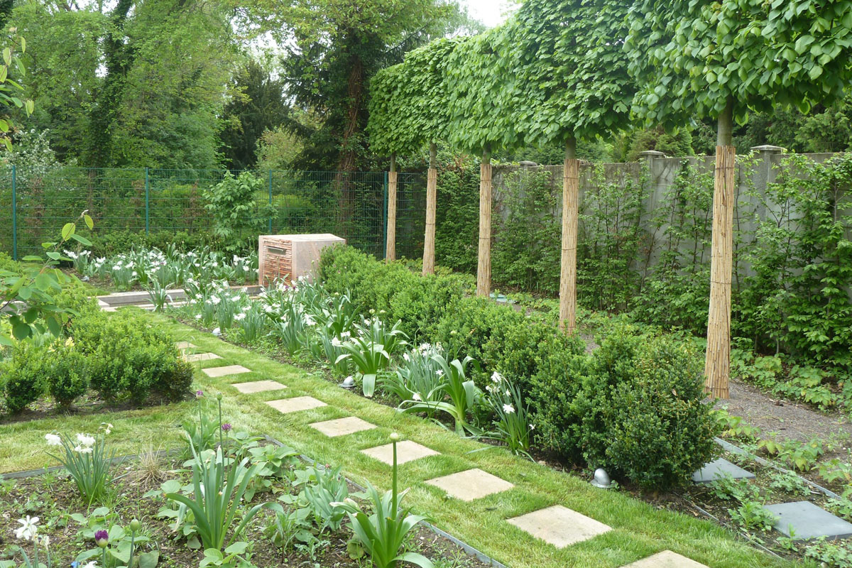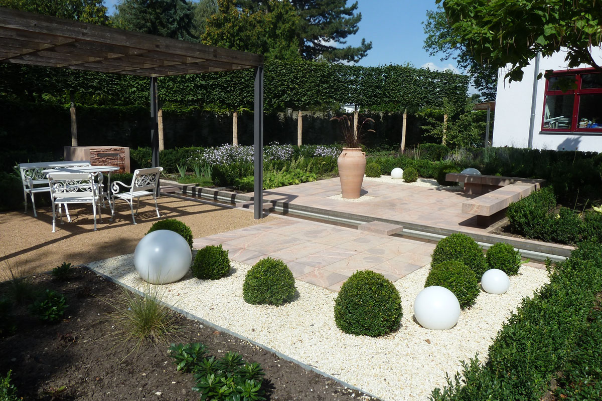 Bestehende Strukturen und Anlagen, wie das lineare Wasserbecken oder auch die vorhandene Pergola, sollten teilweise in das neue Gestaltungskonzept integriert werden. Ebenso war es ein Anliegen des Bauherren, einem recht formalen Gestaltungsgrundsatz zu folgen, bei dem in Form geschnittene Hecken, Bäume, Sträucher eine wichtige Rolle spielen. Daneben bestand die Notwendigkeit eines hohen Sichtschutzes zum benachbarten Friedhof, der auch die Höhe des Bürogebäudes berücksichtigt, aber hinsichtlich des Platzbedarfs und der räumlichen Wirkung auf die Proportionen der Anlage Rücksicht nimmt.