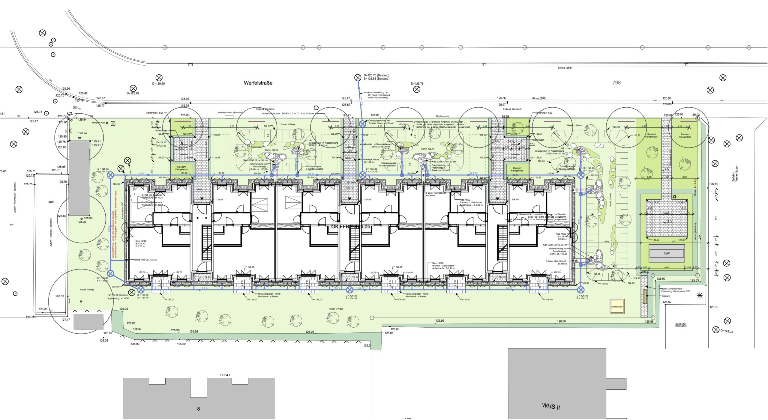 Für den Neubau des Wohnhauses in der Werfelstraße in Leipzig sollten die Außenanlagen gestaltet werden. Zentrales Element der Freianlagenplanung war die im Sinne ders Schwannstadt-Prinzips vorzusehende oberflächennahe Regenwasserrückhaltung und -versickerung. Eine vollständige Versickerung ist aufgrund der anstehenden Bodenverhältnisse nicht möglich. Trotz der beengten Platzverhältnisse kann das Ziel einer maximalen Regenwasserrückhaltung durch die Anlage von drei begrünten Retentionsmulden umgesetzt werden. Der rechnerische Nachweis hierfür wurde mit dem zu erstellenden Überflutungsnacheis erbracht.