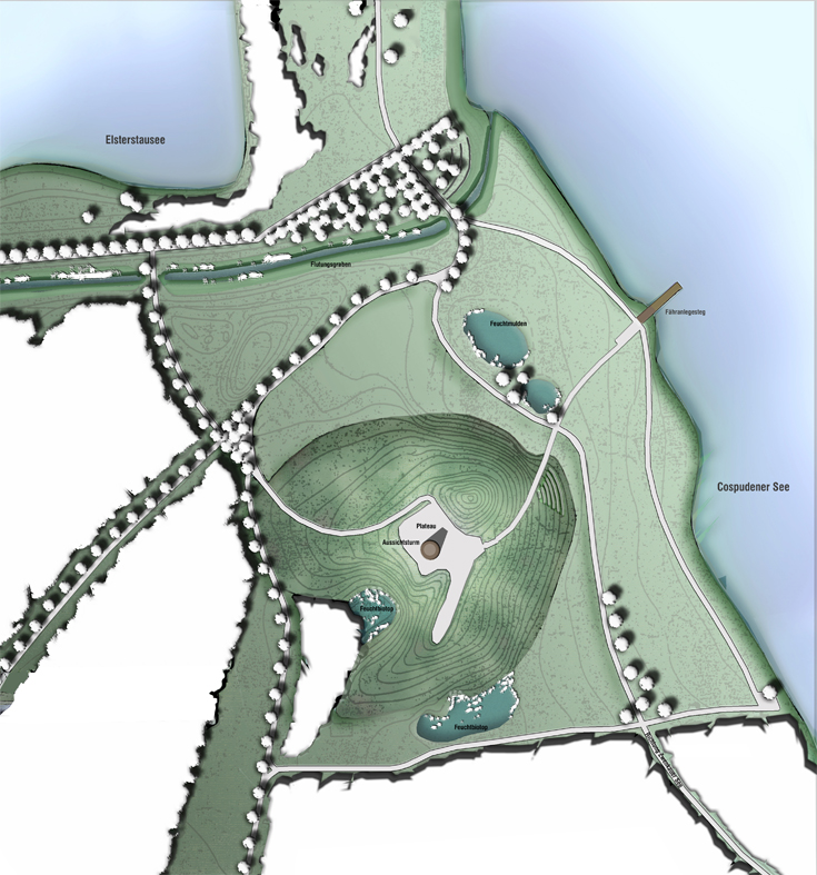 Der Cospudener See war der erste See der Bergbaufolgelandschaft in der Region Leipzig, der einer Nachnutzung übergeben werden konnte. Im Rahmen der Sanierungs- und Rekultivierungsmaßnahmen des ehemaligen Tagebaurestlochs entstand ein Landschaftsraum mit vielfältigem Freizeit- und Erholungsangebot. Die Gestaltung des Aussichtspunktes Bistumshöhe war ein Baustein für die Entwicklung des gesamten Areals, welches als Modellprojekt für die Möglichkeiten der Gestaltung einer Bergbaufolgelandschaft fungierte und ein Projektbeitrag der Stadt Leipzig zur Expo 2000 war. Bestandteil der Planung zum Aussichtspunkt Bistumshöhe war die Standortwahl und Einordnung in das Gesamtkonzept des Cospudener Sees, der Entwurf zur Gestaltung des erweiterten Umfeldes sowie die Genehmigungs- und Ausführungsplanung für die Herstellung des unmittelbaren Turm-Umfeldes.