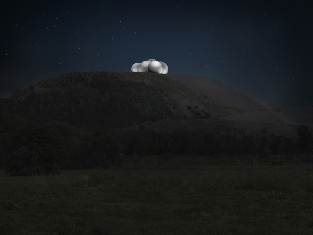 Das Plateau ist als ruhige, ebene Wiesenfläche geplant. Die Landmarke wird auf einem aufgeschütteten Sockel errichtet. Dies verstärkt die schwebende und erhabene Wirkung auf den Betrachter. Die Oberflächenbefestigung der Aufschüttung, welche den Sockel bildet, erfolgt in ungebundener Bauweise. Die Verwendung eines schwarz-grauen Deckschichtmaterials bildet sowohl einen materiellen Kontrast zur artifiziellen, weißen „Wolke“ als auch einen Bezug zum Ursprung der Erhebung und zur Ausgangslage des Ortes.