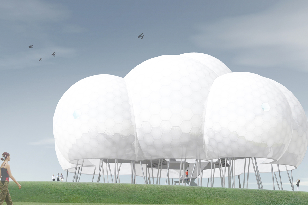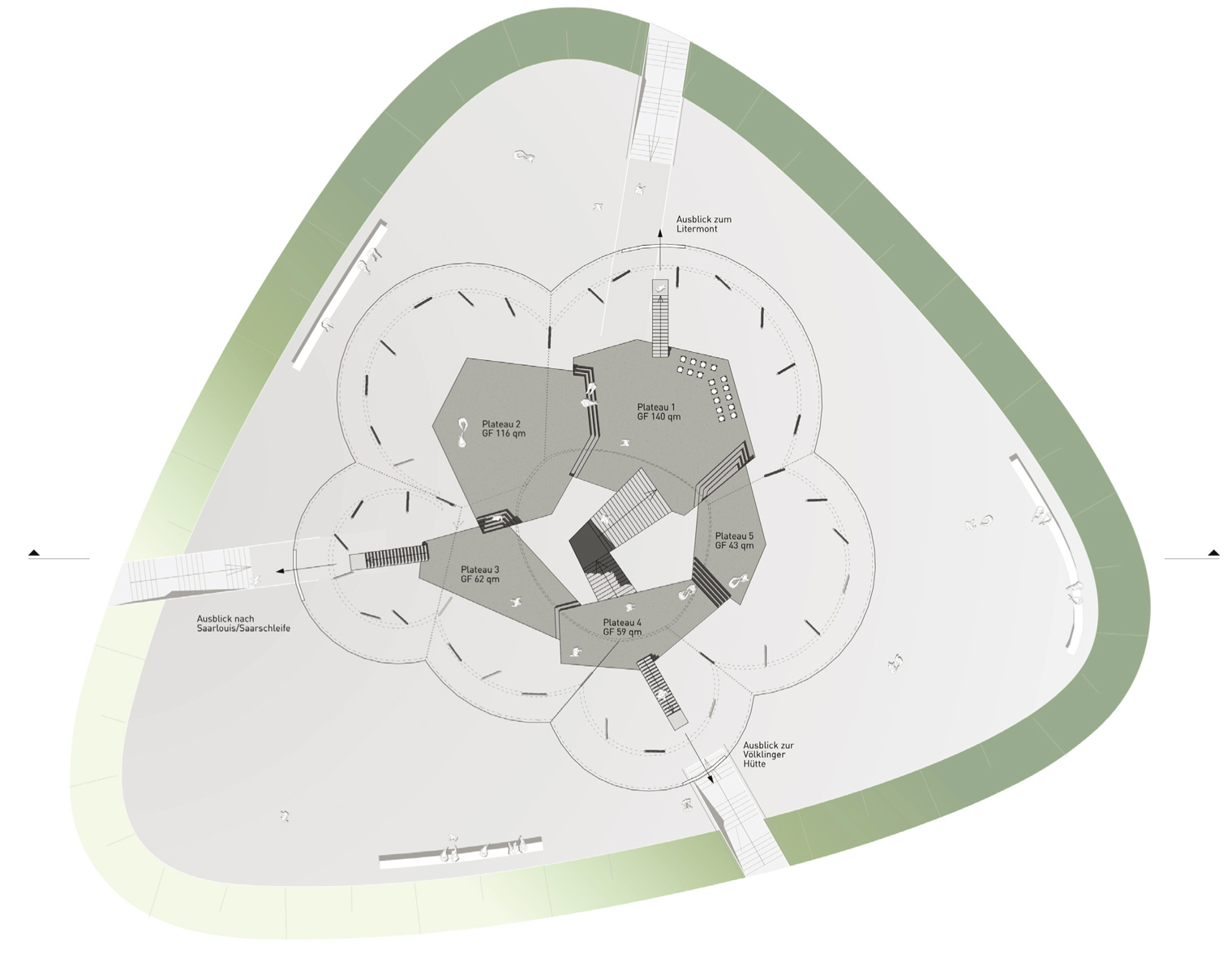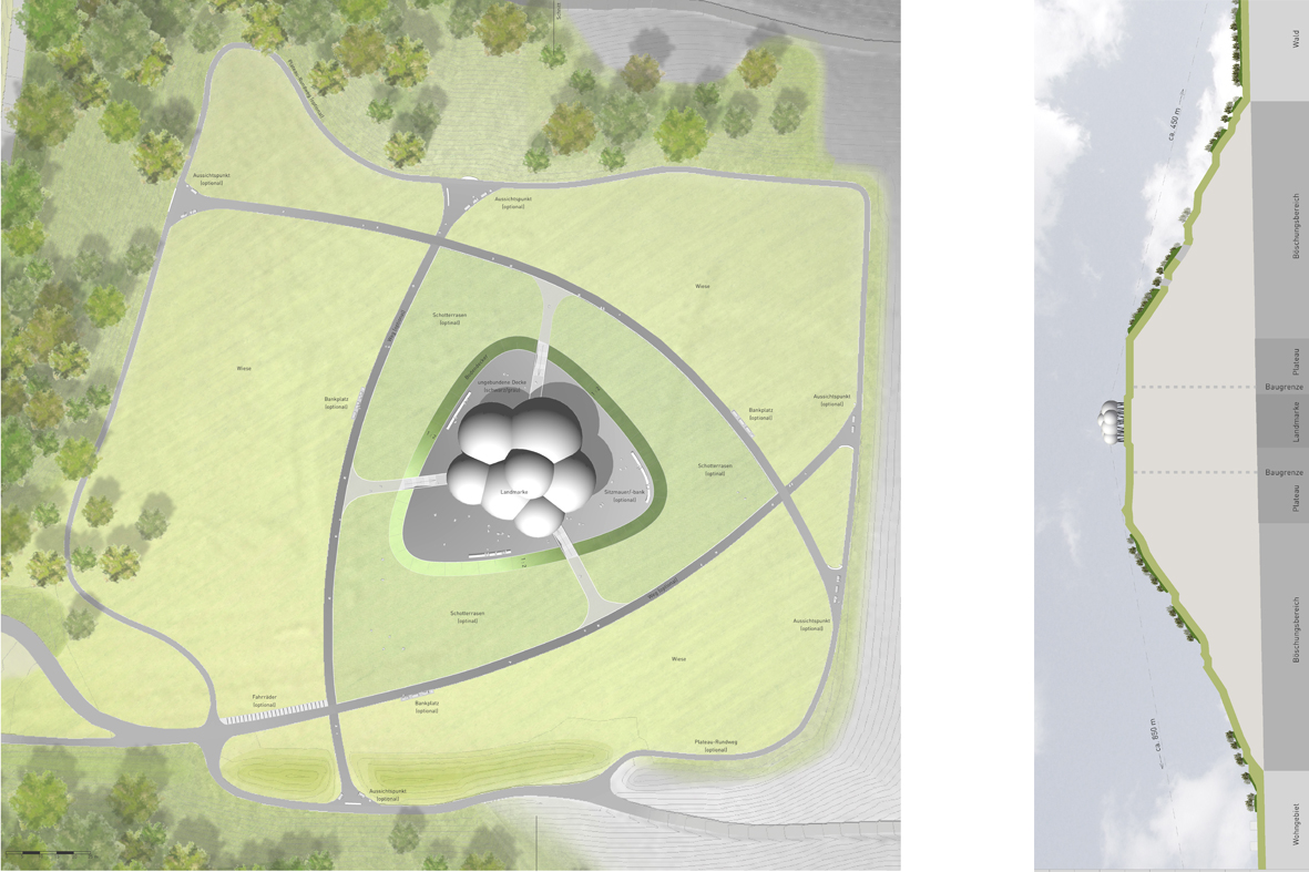 Dem Anspruch an ein in sich stimmiges Gesamtkonzept folgend, wurden neben der eigentlichen architektonischen Lösung für die Landmarke weitere Erschließungs- und Gestaltungsmaßnahmen auf dem Haldenplateau vorgeschlagen. Wesentlicher Bestandteil des Freiraumkonzepts ist ein das Plateau erschließendes Wegesystem, welches dem Besucher differenzierte Erlebnisebenen bietet. Die Hauptwege führen nicht direkt zur Landmarke und bieten dadurch eine langsame und räumlich interessante Annäherung. Vorbei an der „Wolke“ führen die Wege zu verschiedenen Aussichtspunkten – mit einem Ausblick sowohl auf die Umgebung, als auch zurück auf die Bebauung. Der diese Punkte verbindende Rundweg ermöglicht ein Umkreisen und führt aufgrund des unregelmäßigen Baukörpers zu stetig wechselnden Ansichten.