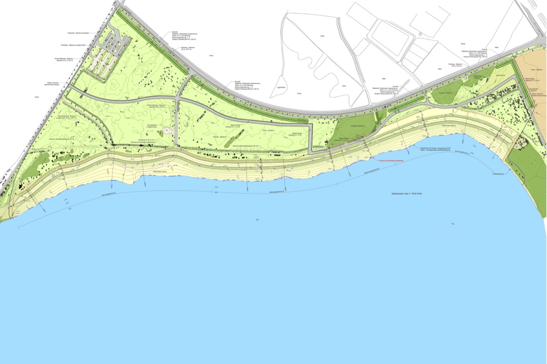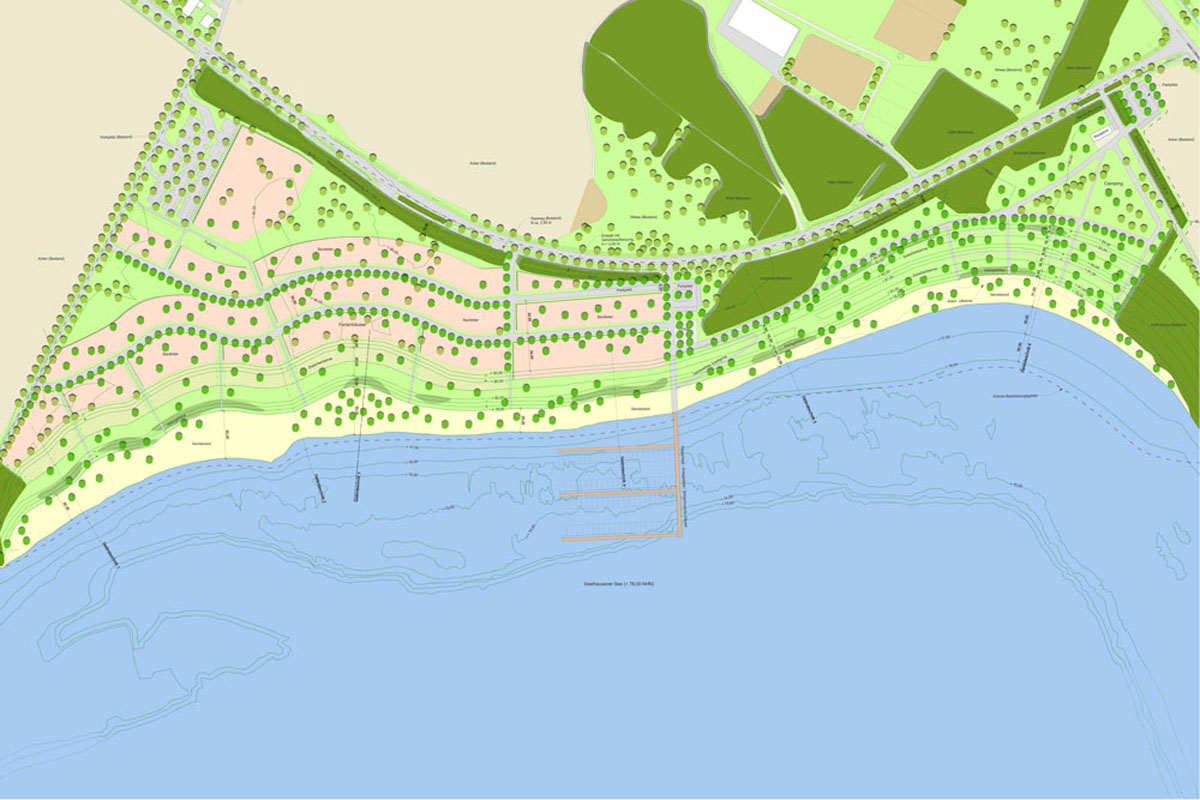 – Erarbeitung eines Gestaltungskonzepts unter Bezugnahme auf die geplante spätere Nutzung mit der Darstellung von Funktionsflächen für Baden, Camping und Bebauung einschl. Vorschlägen für mögliche Bepflanzungsmaßnahmen, Hauptwegebeziehungen, Parkplätze, Steganlagen u.ä.