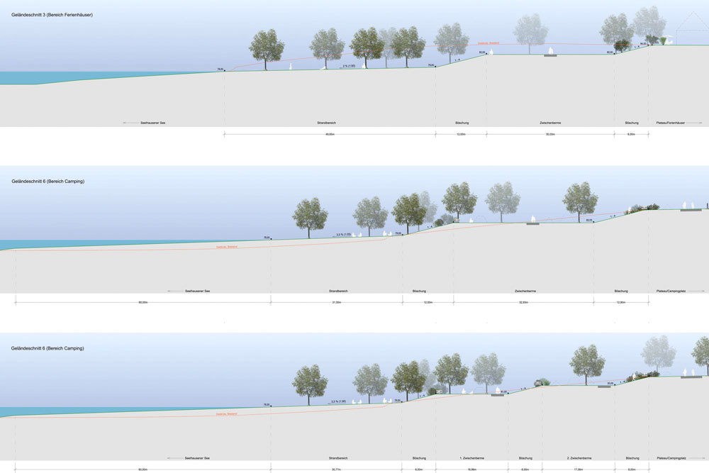 – Geländemodellierung einschl. notwendiger Entfernung des vorhandenen Wildaufwuchses mit dem Ziel der Anlage ausreichend dimensionierter Strandflächen sowie der Flächenbereitstellung für eine spätere Ferienhaus- und Campingplatznutzung.