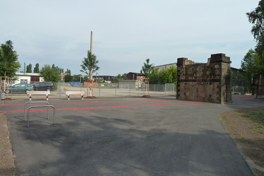 Neben der beschriebenen Eingangssituation bildet der weiter nördlich befindliche Wegeabschnitt im Bereich einer ehemaligen Gleisbrücke einen Gestaltungsschwerpunkt innerhalb des Planungsgebiets. Da die Brückenpfeiler beim Abbruch der ehemaligen Gleisüberführung erhalten blieben, prägen sie noch heute maßgeblich das Erscheinungsbild des Geländes. Diese nicht nur zu erhalten, sondern in Ihrer visuellen Wirkung und Wahrnehmung zu stärken, ist es ein erklärtes Ziel für die Neugestaltung der Flächen. Die im Bereich der Brückenpfeiler platzartige Aufweitung des ansonsten lediglich 3 m breiten Asphaltweges dient unter anderem diesem Zweck. Verstärkt wird der Effekt durch die Markierung des ehemaligen Brückenverlaufs in Form farbiger Streifen auf der Asphaltfläche. Hierdurch gelingt es, die Brückenpfeiler mit einfachen Mitteln der Flächengestaltung wieder verstärkt als Zeugnisse der industriellen Vergangenheit des Bahnareals ins Bewusstsein der Öffentlichkeit zu rücken, anstatt diese zu ignorieren oder gar zu beseitigen. Sitzbänke und Abfallbehälter laden darüber hinaus zum Treffen und Verweilen ein und entsprechen – ebenso wie die den Platz zum benachbarten Gewerbegebiet räumlich abgrenzende Baumreihe – den Anspruch an diese Fläche, mehr als nur Durchgangsraum zu sein.