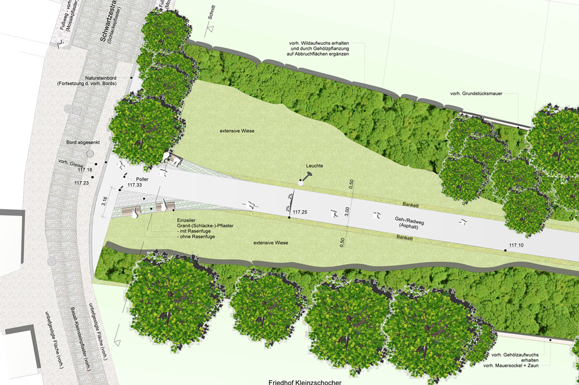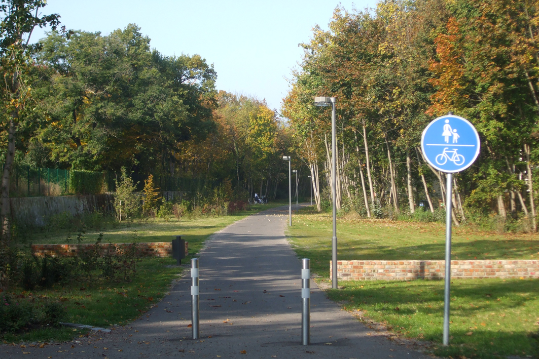 Mit der Neuanlage eines Radweges und den begleitenden Gestaltungsmaßnahmen erhielt der ehemals industriell geprägte und eher durch Verwahrlosung und Verfall gekennzeichnete Raum einen neuen Impuls für seine Rückeroberung als erlebbare Grünfläche im Stadtgebiet.