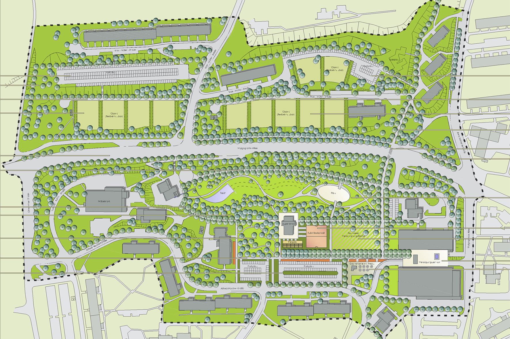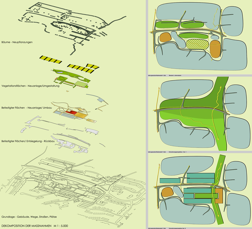 Die in der Mitte des Stadtteils neu entstandenen Freiräume sollen differenzierte Funktionen übernehmen und unterschiedliche Gestaltungen erfahren. Sie staffeln sich auf mehreren Etagen wie Terrassen den Hang hinab in Richtung des Dorfes Markersdorf. Die auf der oberen Etage befindlichen Flächen, die sich westlich an das bestehende Versorgungszentrum anschließen, sollen neu gegliedert und intensiv gestaltet werden, um die Entwicklung eines attraktiven Wohngebietszentrums zu fördern. Die darunter liegende Ebene wird parkartig gestaltet und bietet den Anwohnern vielfältige Möglichkeiten zum Erholen und Entspannen und integriert darüber hinaus eine Veranstaltungsfläche. Für die unterste, nördlich der querenden Wolgograder Alle gelegene Ebene wurde vorgeschlagen, diese Fläche nach weiterem Rückbau von Straßen und Parkplätzen zu begrünen und in Claims zu gliedern, die in privater Initiative individuell gestaltet und bewirtschaftet werden können.