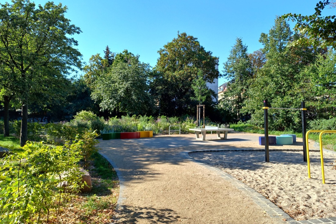 Im Norden ergänzt eine Doppelschaukel das Angebot. Anstelle der „Nautilus“-Konstruktion entstand ein gepflasterter Aufenthaltsbereich mit Großbaum als Schattenspender. Weitere Sitzgelegenheiten mit Blickbezug zur Taborkirche wurden im Süden angeordnet. Umfangreiche Stauden-, Gräser- und Strauchpflanzungen verleihen dem Platz einen parkähnlichen Charakter und erhöhen Aufenthaltsqualität sowie Artenvielfalt. Findlinge wurden neu integriert, der Baumbestand vollständig erhalten und durch Neupflanzungen ergänzt; Wegeführungen orientieren sich am Bestand, untergeordnete Wege entfallen.