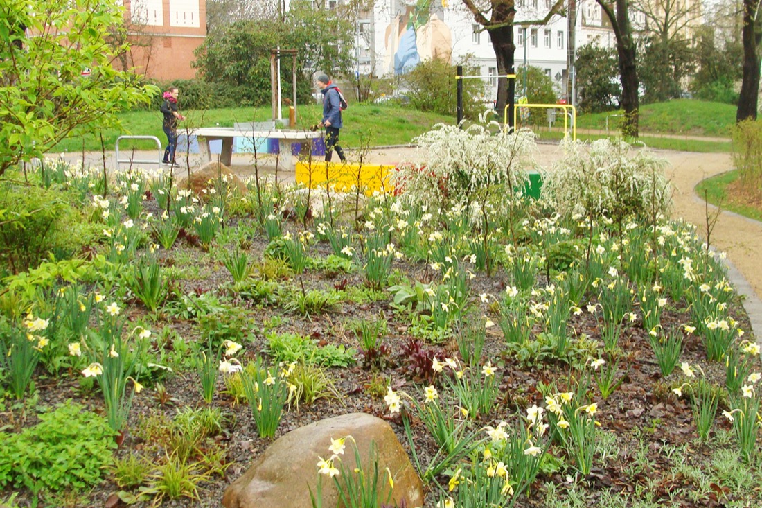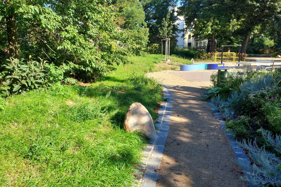 Östlich schließt eine offene, von Hecken gefasste Rasenfläche für (Klein-)Kinder an. Der Spielhügel mit Findlingen blieb erhalten und wurde ergänzt; bewusst wurde auf feste Spielgeräte verzichtet, um freies Spiel zu ermöglichen. Der Sandkasten wurde reaktiviert und mit Matschtischen ausgestattet, Wege neu befestigt.