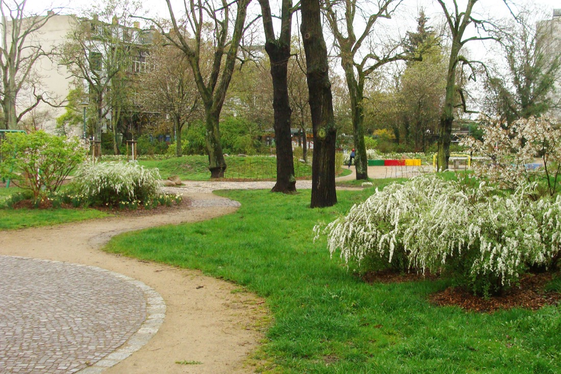 Zentrales Ziel war die räumliche Gliederung in unterschiedliche Aufenthaltsbereiche, umgesetzt durch geschnittene Hecken (Hainbuche, Liguster). Im Westen entstand nahe der Dieskaustraße ein Jugendbereich mit Sitzgruppen, Tischtennisplatte und kleiner Calisthenics-Anlage. Eine überarbeitete Geländemodellierung mit Pflanzflächen sowie Fahrradbügel ergänzt diesen Bereich.