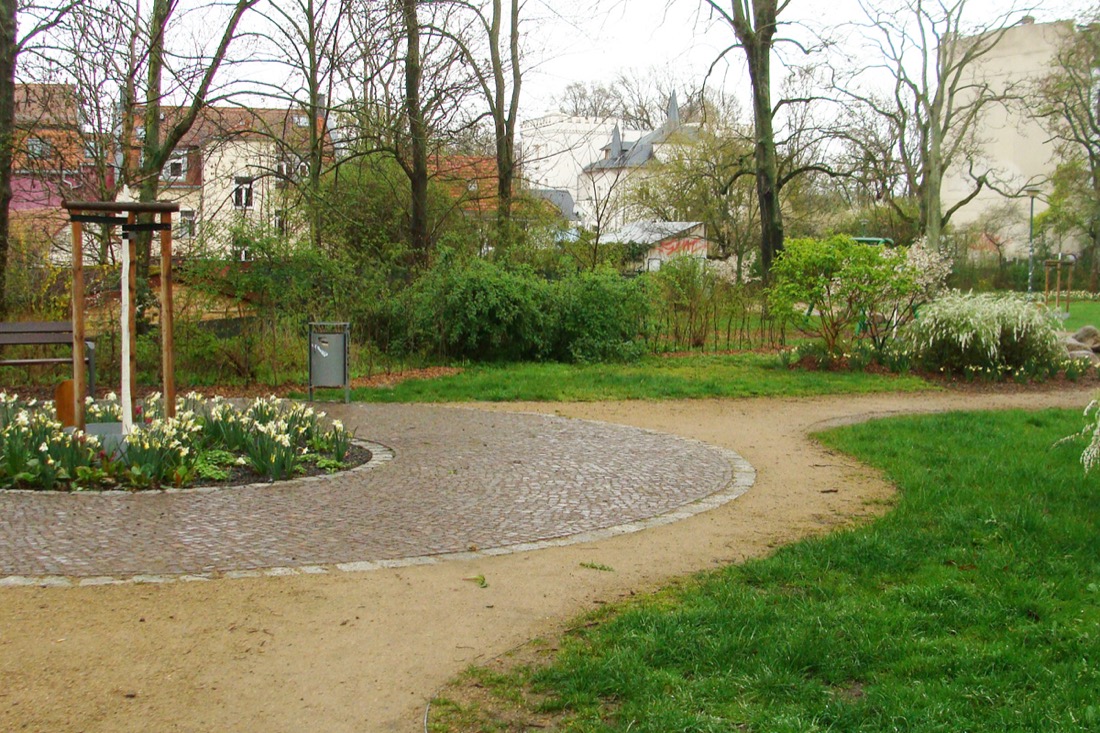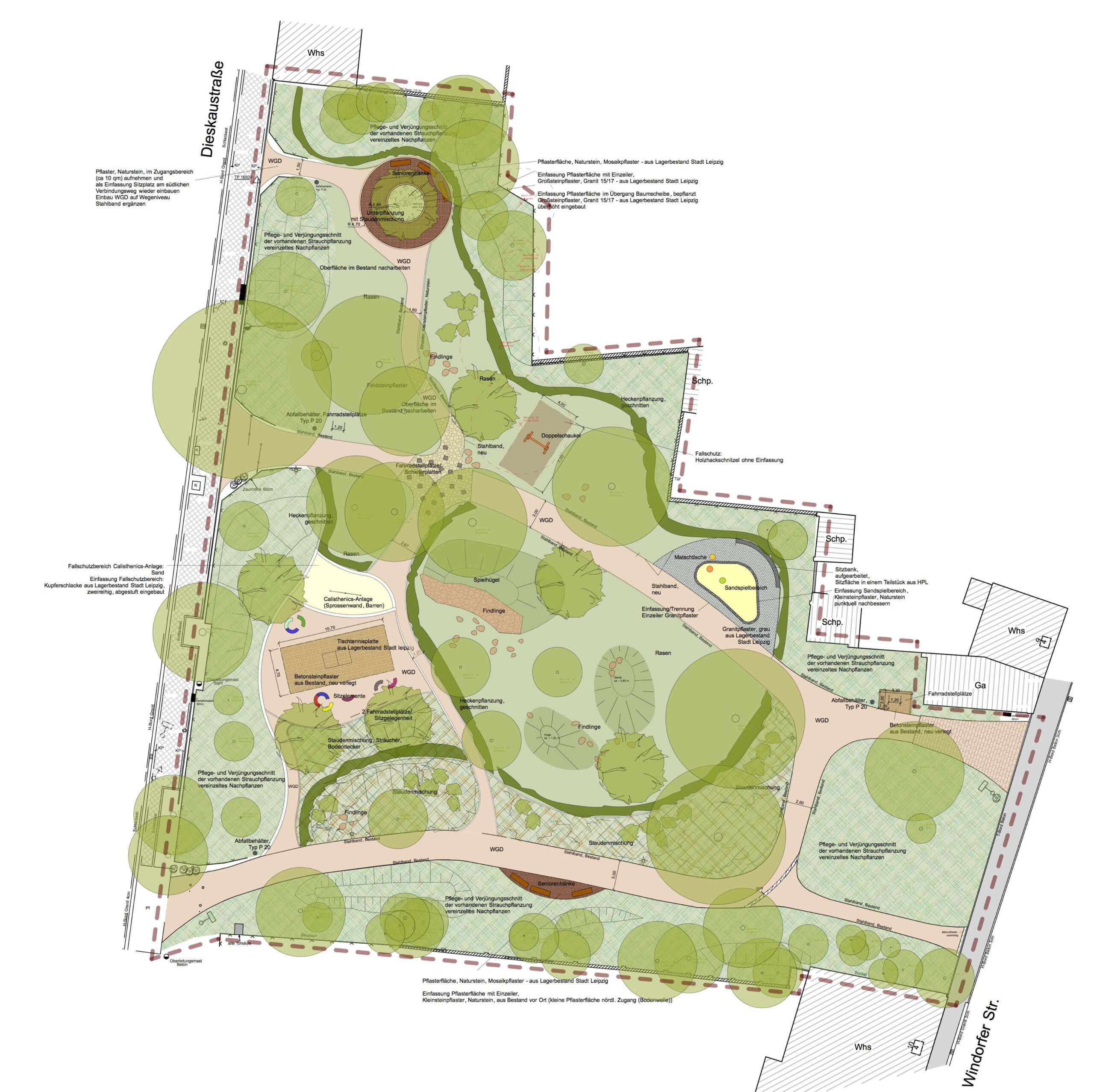 Das Planungskonzept wurde mit dem Amt für Stadtgrün und Gewässer, dem Leipziger Kinderbüro und dem Büro LAGO im Rahmen einer Bürgerbeteiligung abgestimmt und anschließend weiter konkretisiert. Aus Gründen der Nachhaltigkeit und Kostenersparnis wurden vorhandene Materialien weitgehend wiederverwendet. Hauptwege und Stahleinfassungen blieben größtenteils erhalten, Beläge wurden erneuert, ausgewählte Pflasterflächen gesichert.